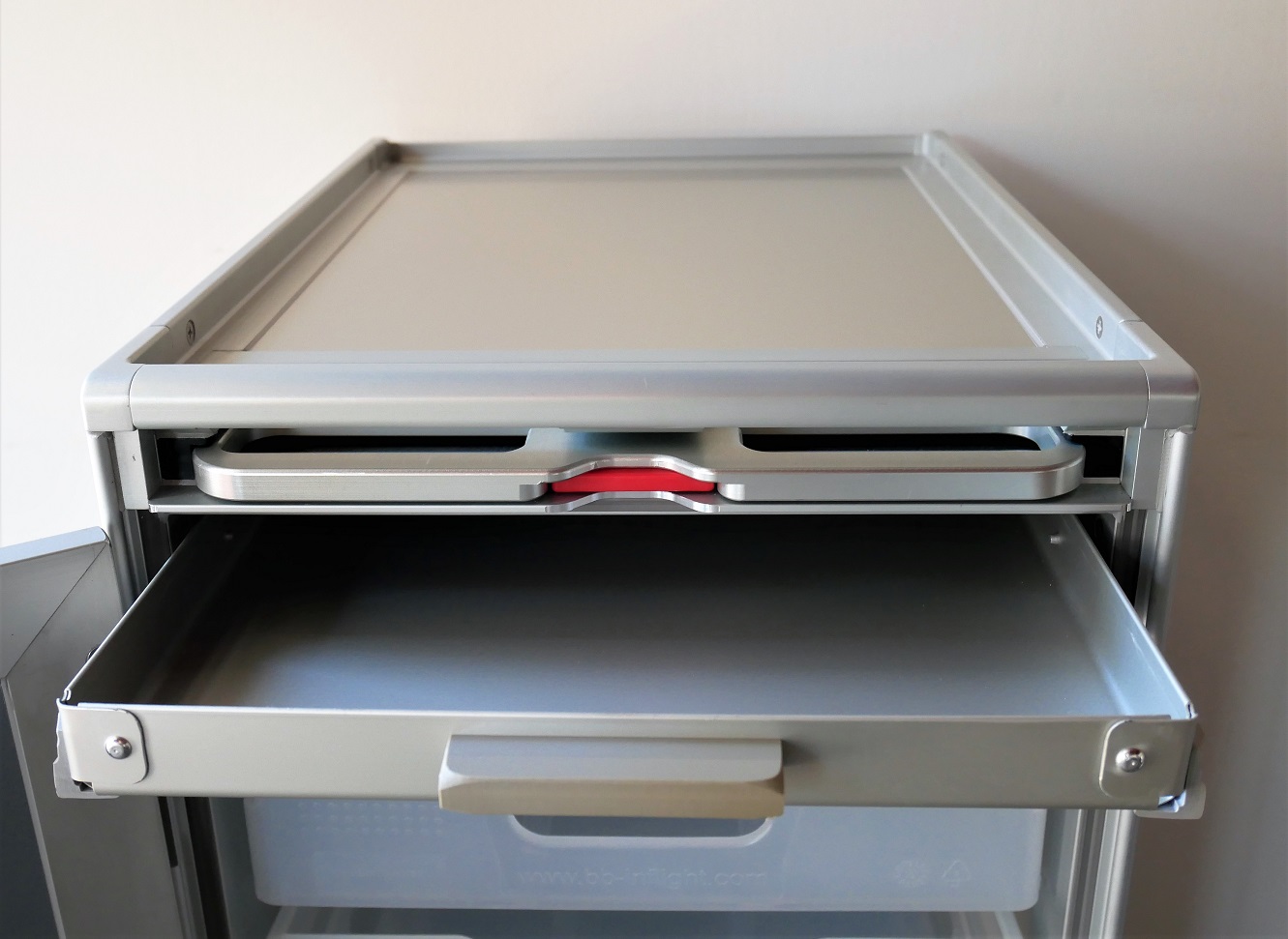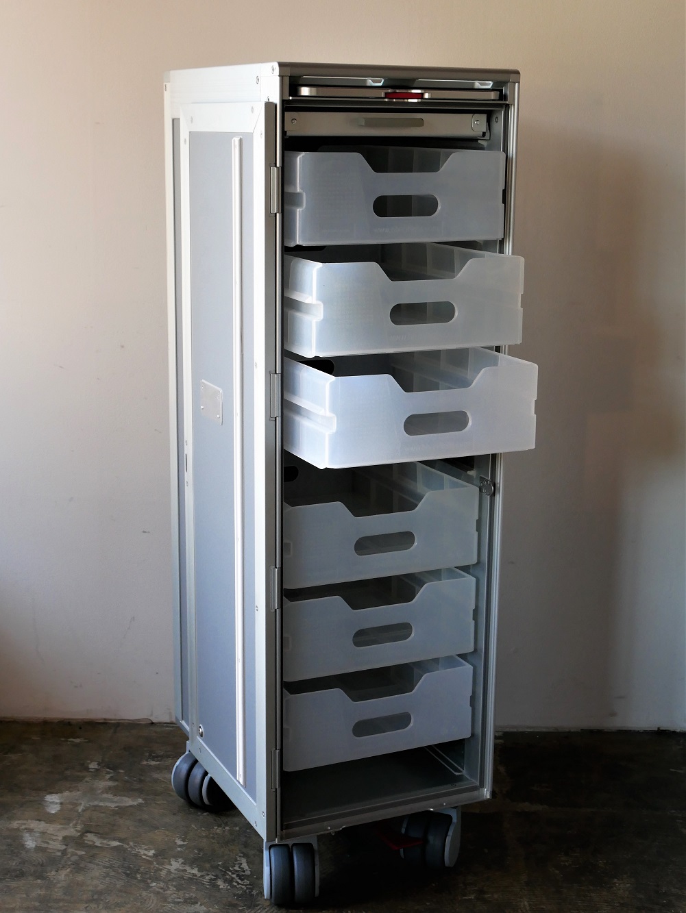収納ボックスが6段付属、アルミニウム薄型引出し1段、