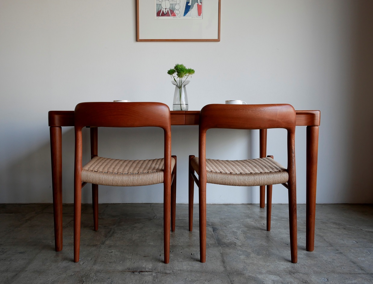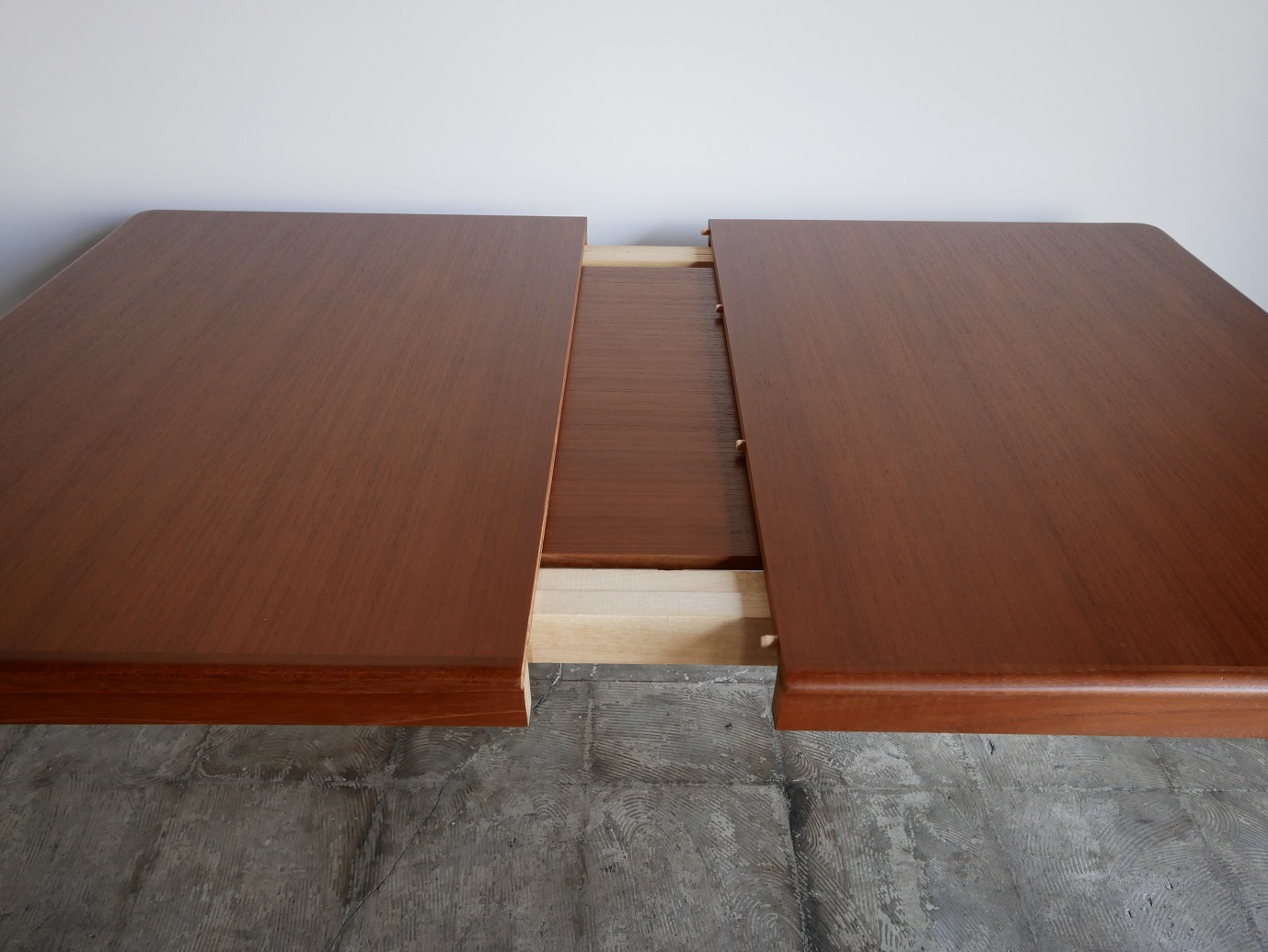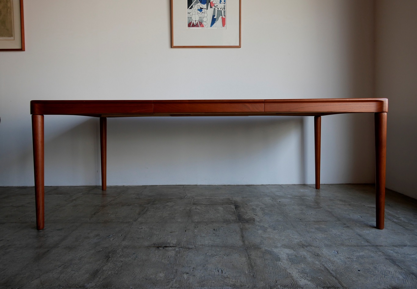 天板周囲のなめらかに削り込まれたライン、 ラウンドしたコーナーと、華美なデザインで はありませんが質感の高い優美なフォルム です。 天板下収納で拡張テーブル1台付属:幅60㎝ 天板幅 195㎝まで拡張します。 manufacture:Bramin made in Denmark(店頭在庫)