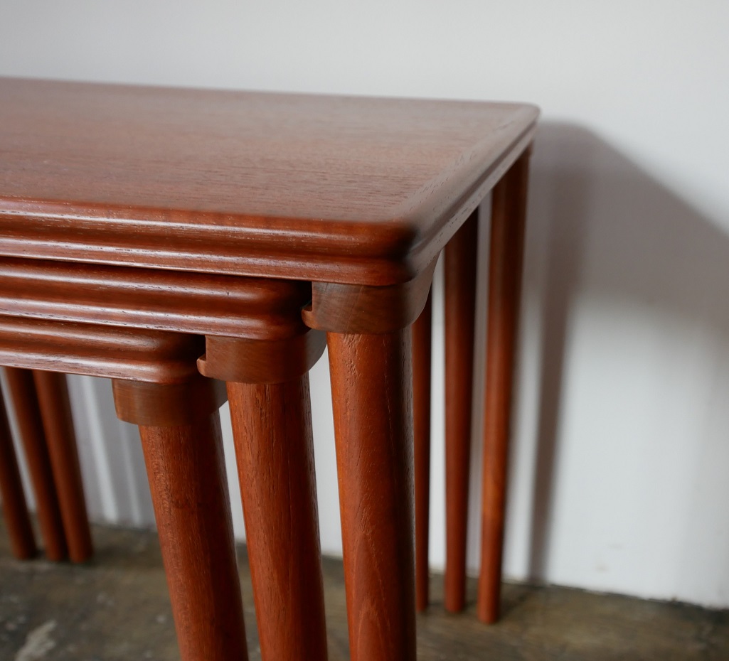 シンプルなデザインのネストテーブル、材質は チーク材です。天板エッジを彫り込んだデザイン が特徴です。テーブルは引き出し式で収納されるので移動にも 便利です。古い塗装を剥離後にラツカーで再塗装済み。 軽く水拭き可能です。 made in Denmark