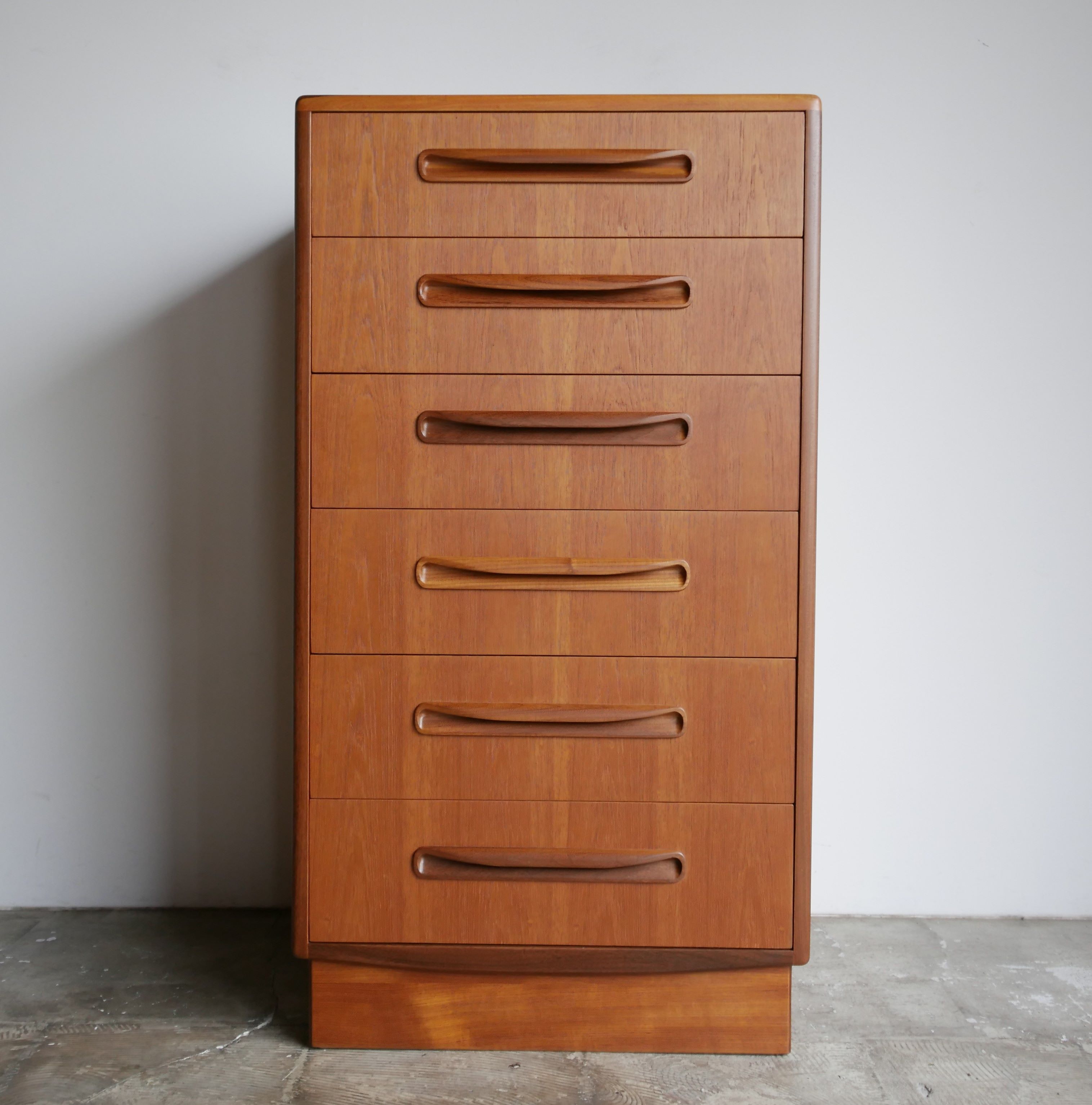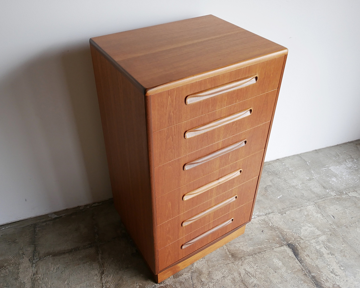 英国E.GOMME社のブランドG-PLANの6段チェスト。 スカンジナビアスタイルの影響を色濃く受けた フレスコシリーズの家具はどれも奥行きが浅く コンパクトなサイズのお部屋にもすっきりと収まる人気の シリーズです。巻貝のようなデザインのシェルハンドルが 特徴です。リビング、寝室、書斎や子供部屋などに お薦めです。