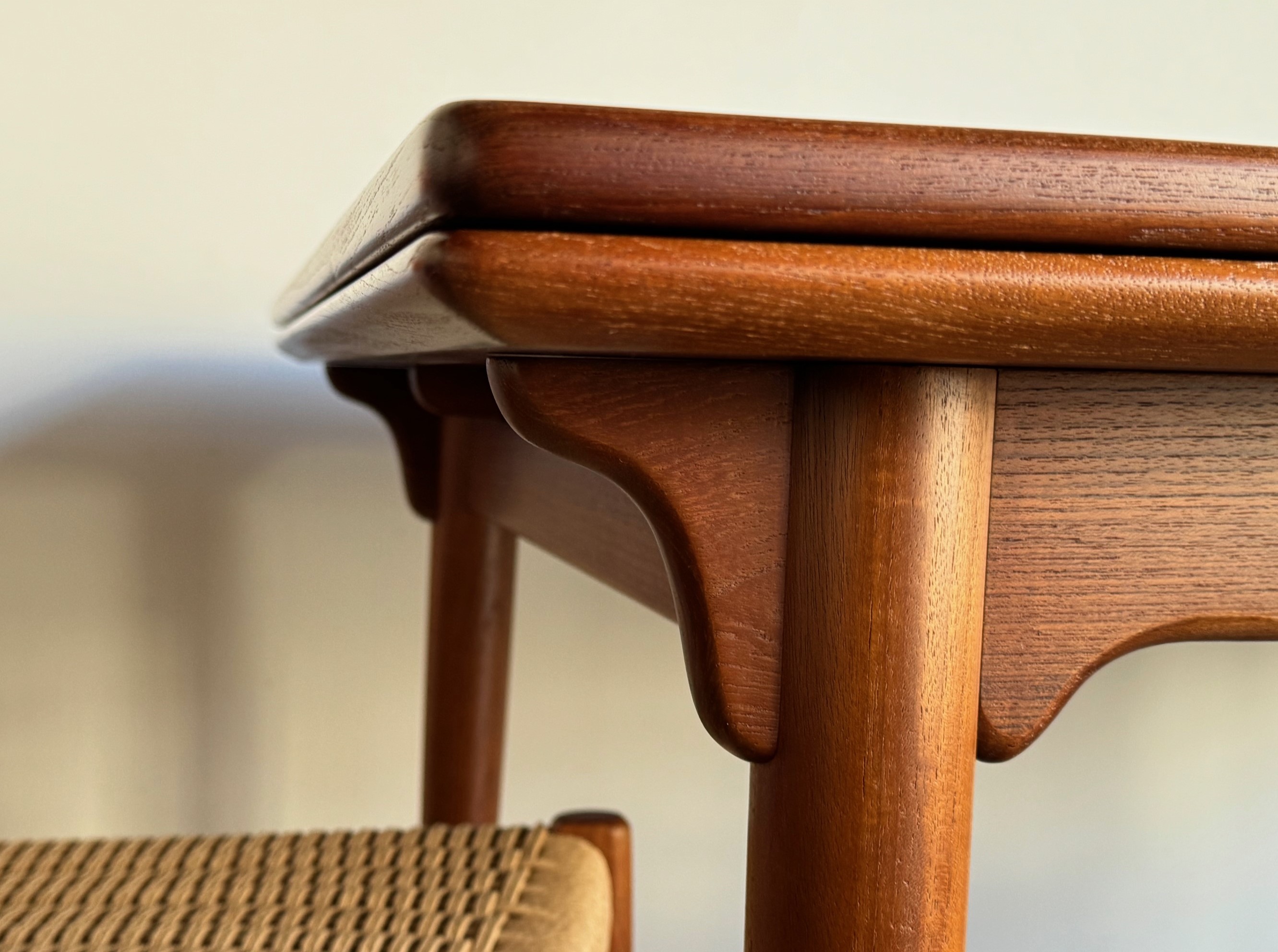 Omann Jun社製ダイニングテーブルNO.54 天板下幕板のアールがデザインポイント。拡張のリーフはエッジを斜めに 削り込むことでよりメイン天板との一体感が生まれています。