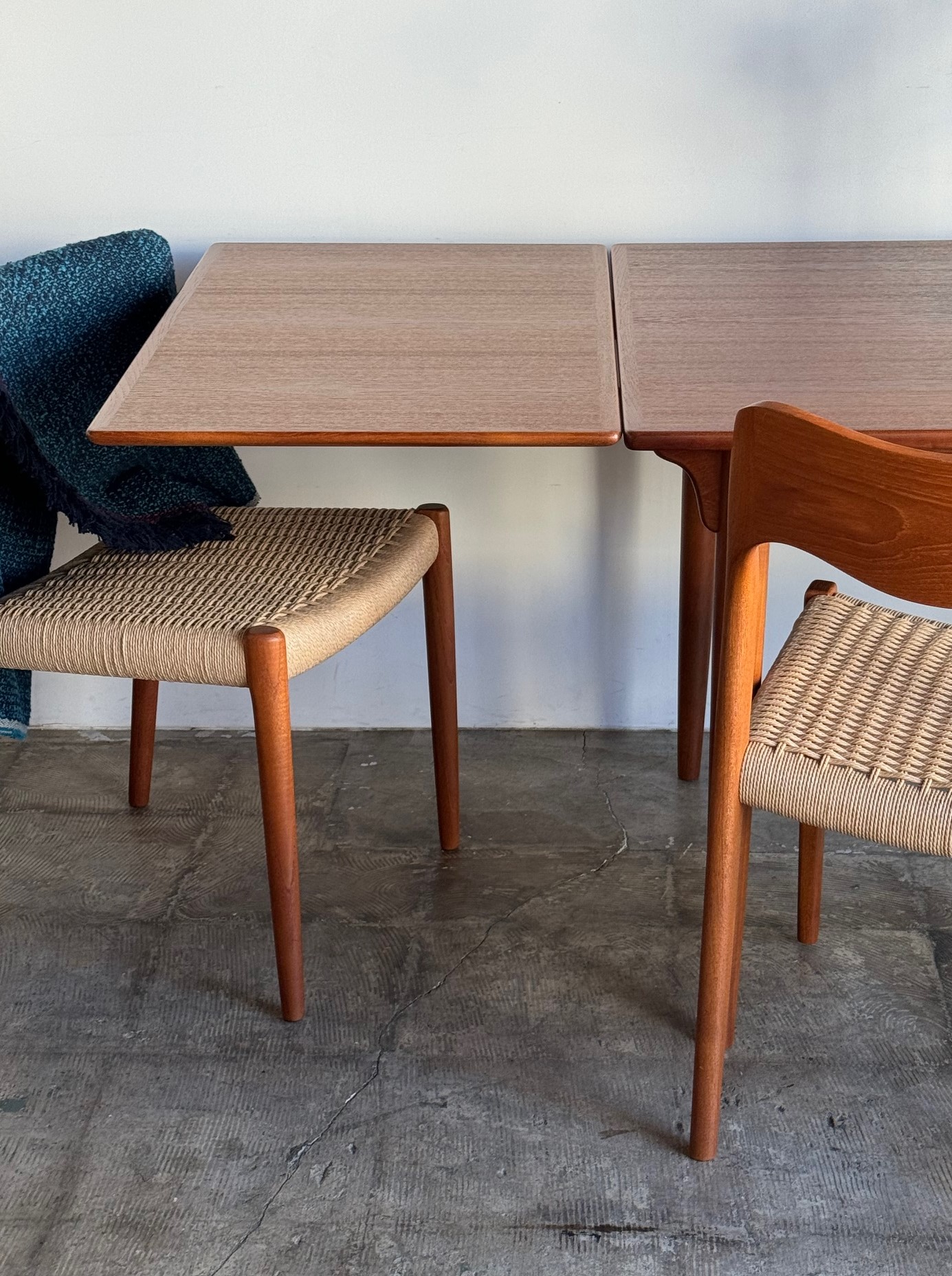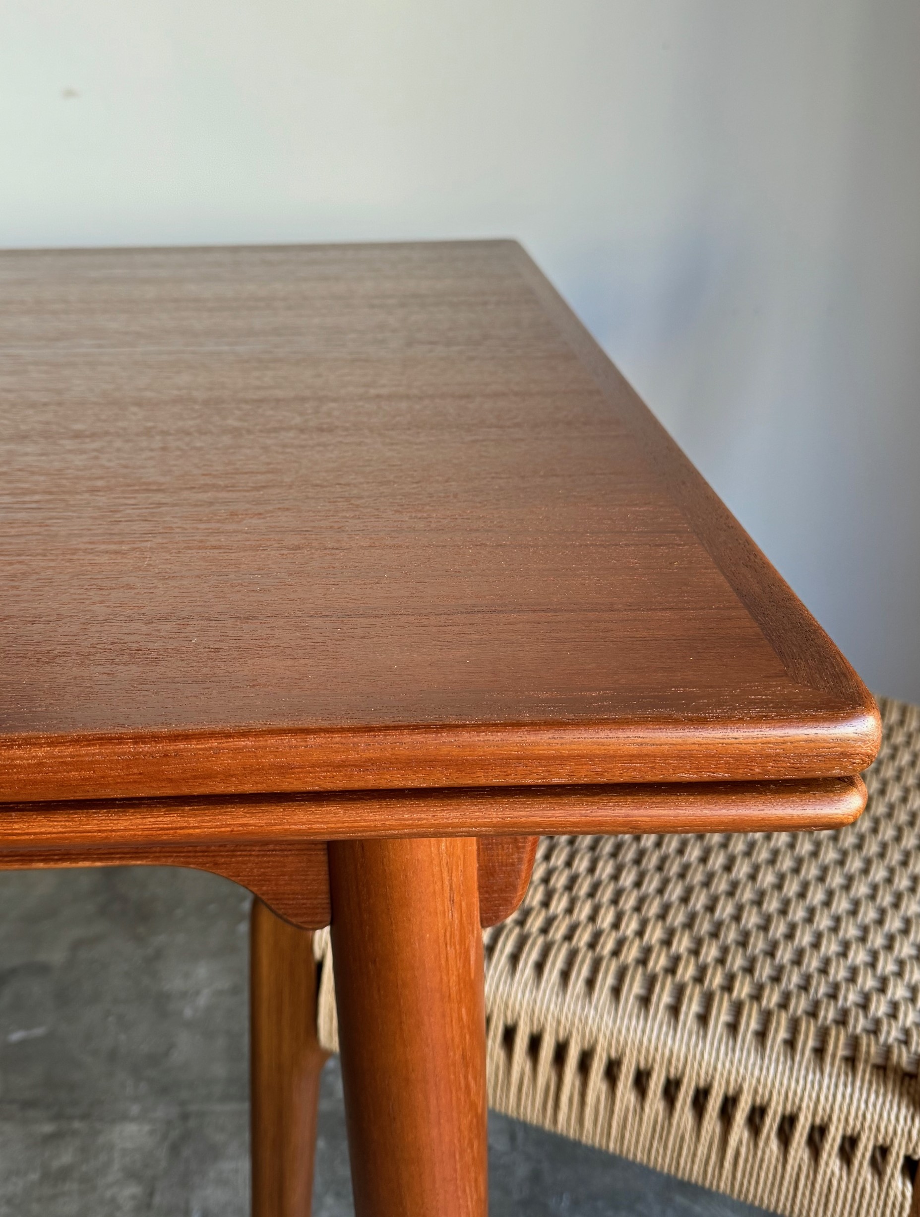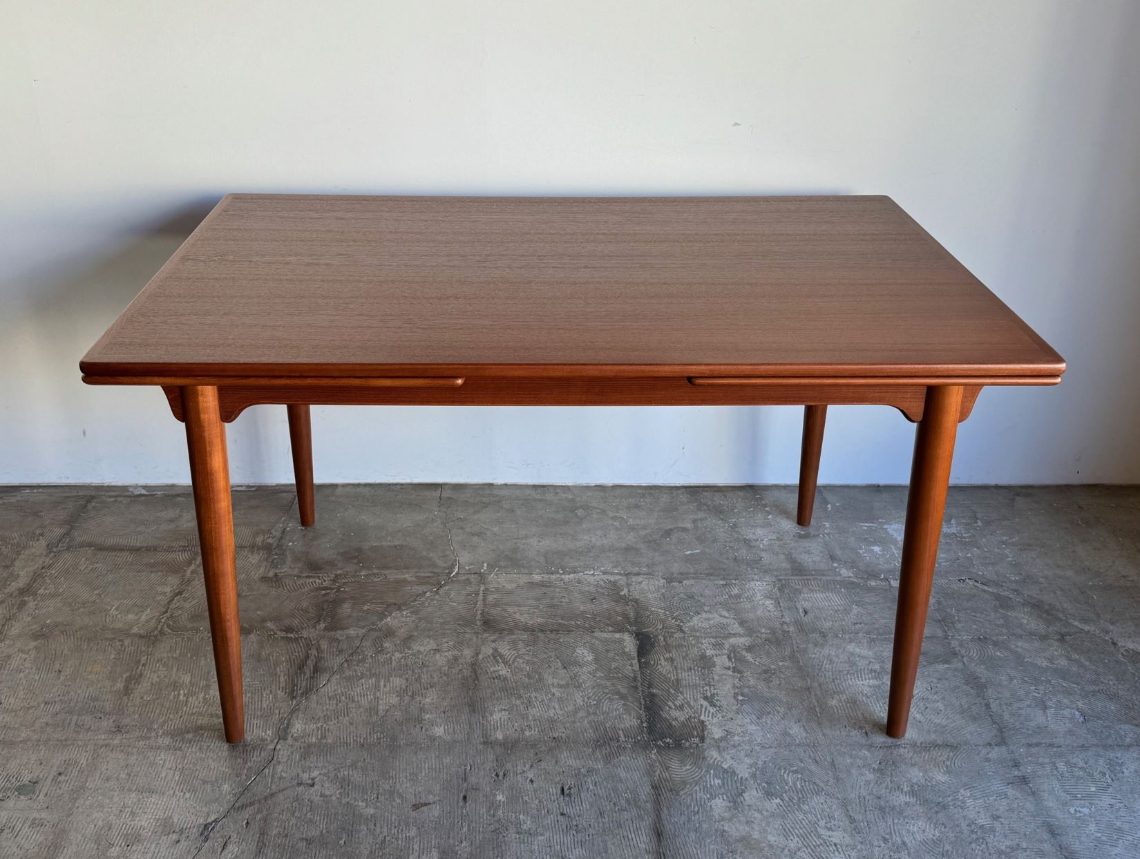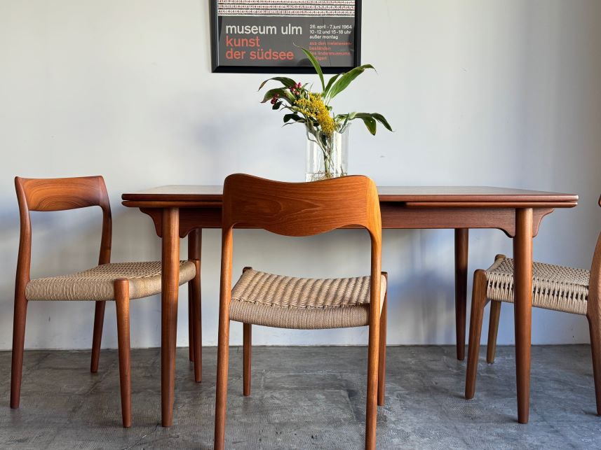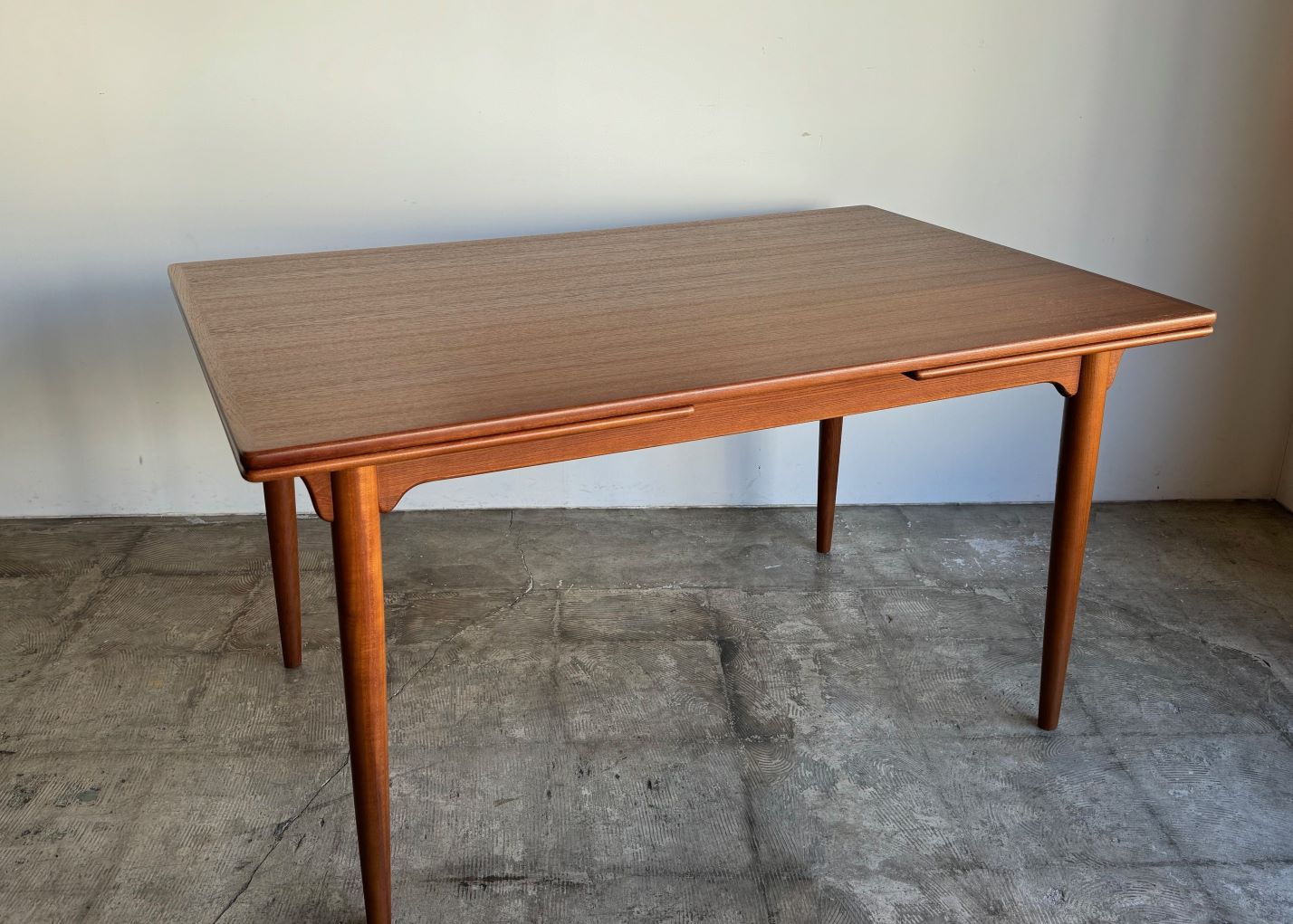 天板、脚ともに古い塗装を剥離後にラッカーで再塗装仕上げ しております。水拭きも可能です。 片側52cm拡張し最大幅239cmとなります。 manufacture: Omann Jun made in Denmark