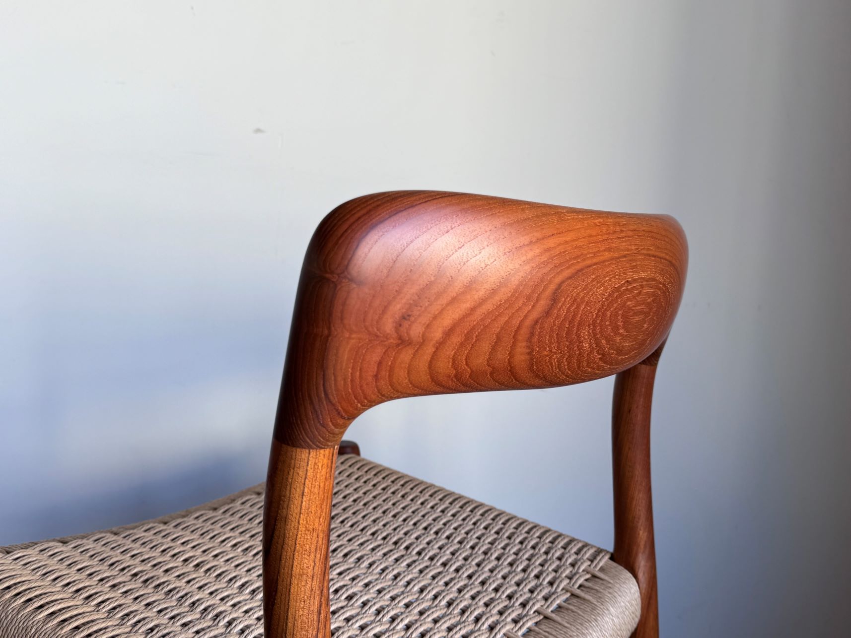 J.L. モラー社製、ニールスモラー1954年デザインのNO.75 ダイニングチェアです。背面の有機的なカーブが背にやさしく フィットします。チーク無垢材を贅沢に使用し無駄をそぎ落と したシンプルで美しいデザインです。フレームは古い塗装をすべて 剥離し再塗装済み、ペーパーコードは新規張替え済みです。 熟練の職人が時間をかけ丁寧にメンテナンスを施し、 世代を引き継ぎご使用戴ける品質に仕上げています。 座面の高さ43㎝