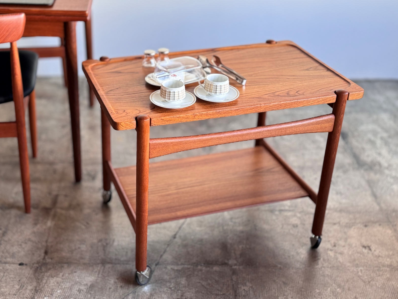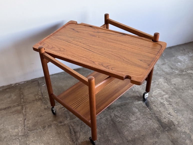 ハンスJ.ウエグナーデザインのサービングトローリーNO.48 材質はチーク無垢+無垢集成材です。天板兼着脱可能で両面 使えるトレーは持ち運びに便利です。古い塗装を剥離後に オイル仕上げで再塗装しております。