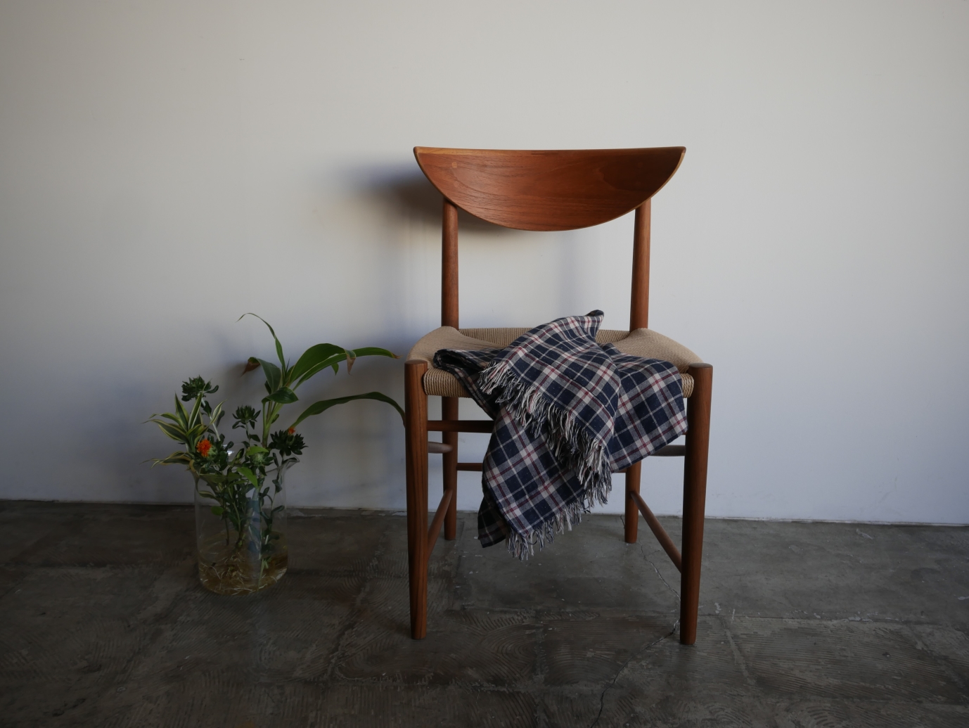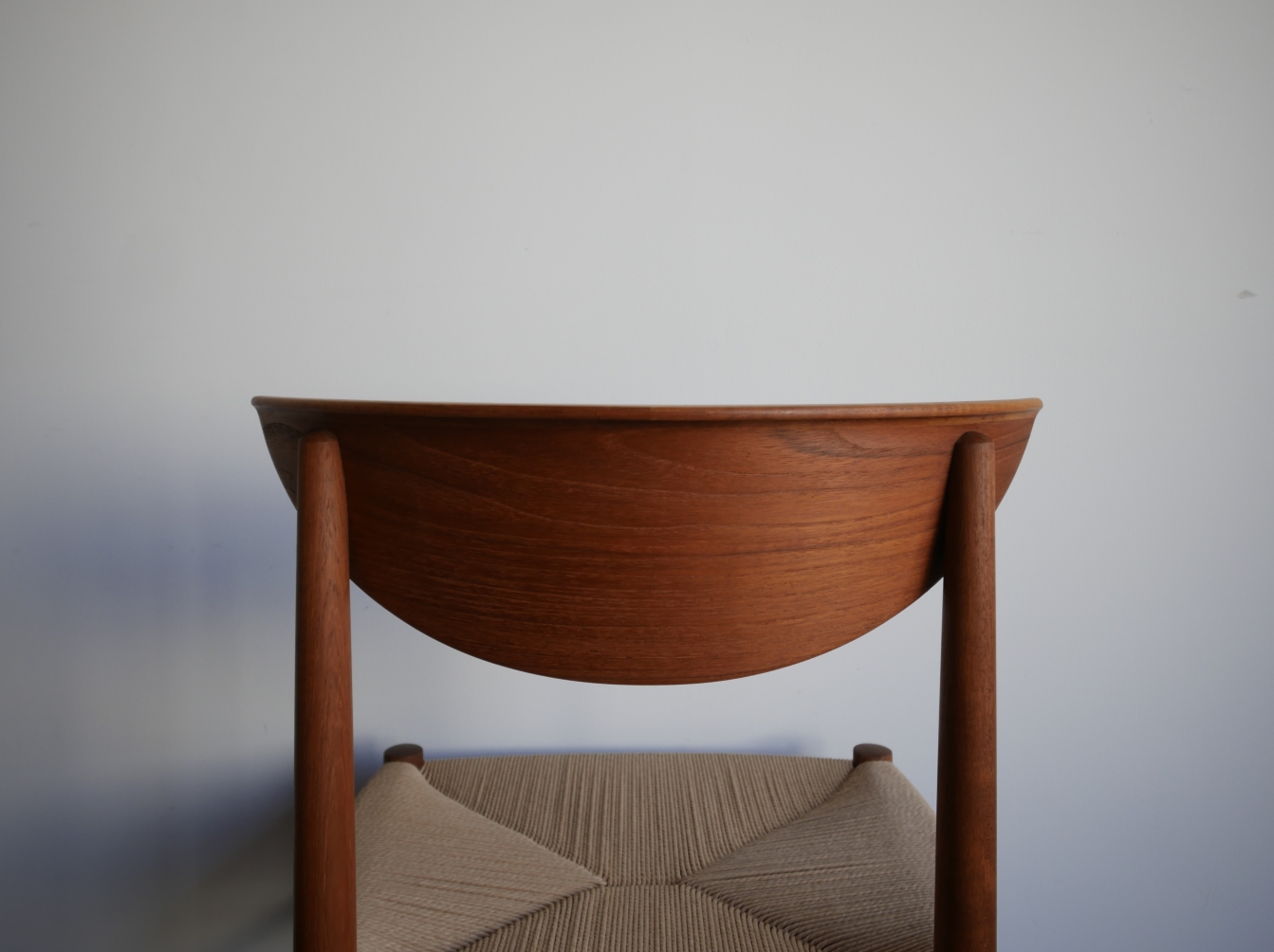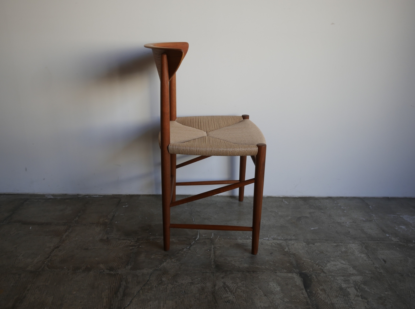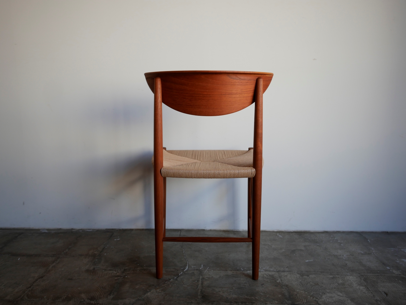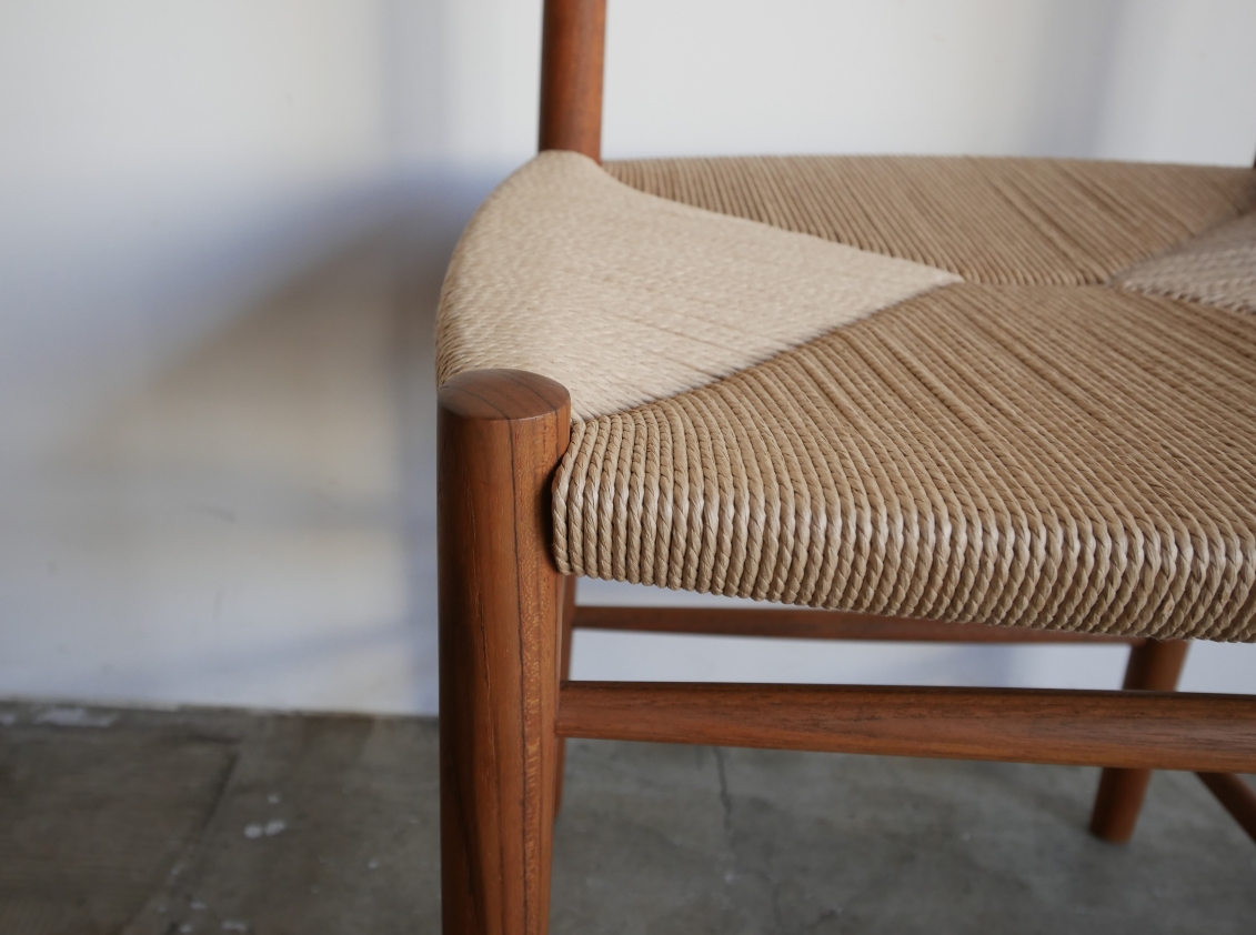 Model NO.316 ダイニングチェア、 ピーター・ヴィッツ&オーラ・ミュルゴー・ ニールセンによる1955年のデザイン。 美しい弧を描くアール状の背もたれは 背にぴったりと寄り添います。背もたれから ストレートにのびる脚のデザインは潔さを感じ、 前後の脚をつなぐ斜め貫は強度を高めるとともに デザインポイントにもなっています。 全方位どこから見ても美しく隙のないデザインです。 古い塗装はすべて剥離し、再塗装仕上げ済み、座面は デンマーク製のペーパーコードで新規張替、フルメンテ ナンス済みでの販売となります。座面の高さ43.5㎝ 在庫1脚