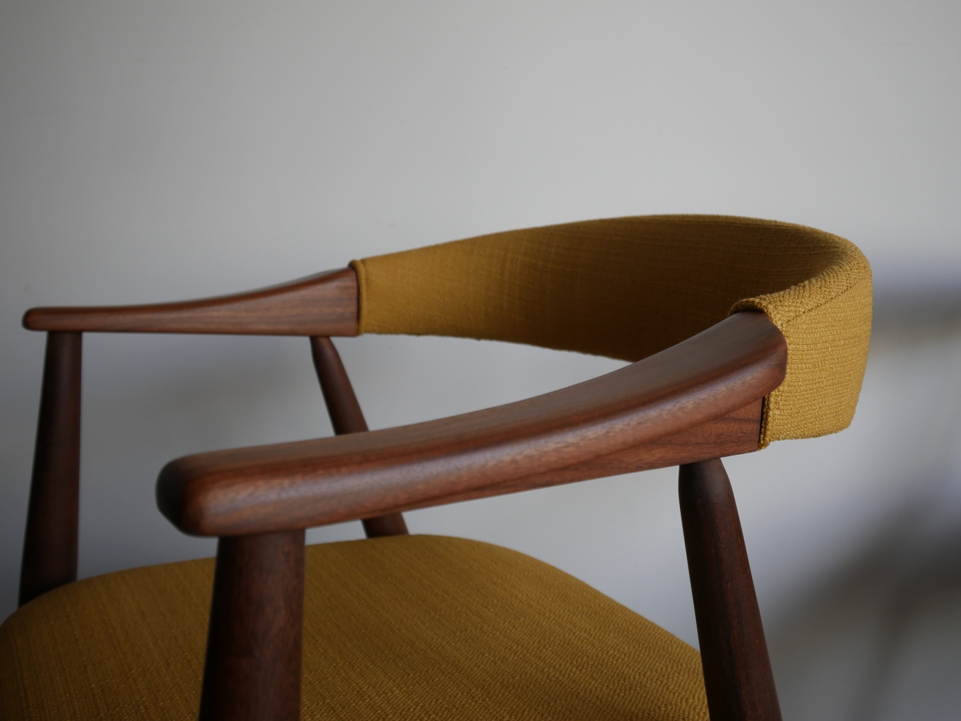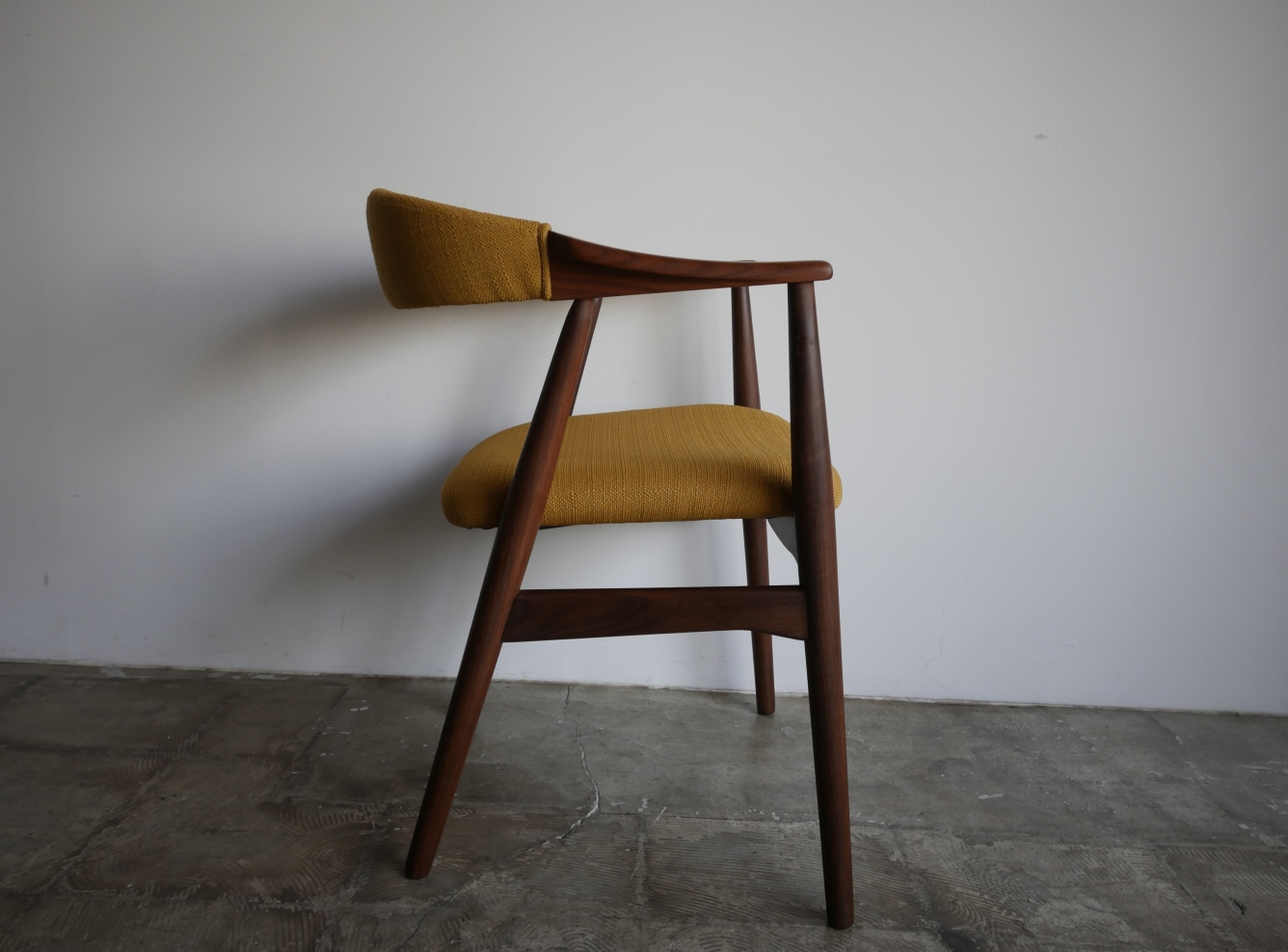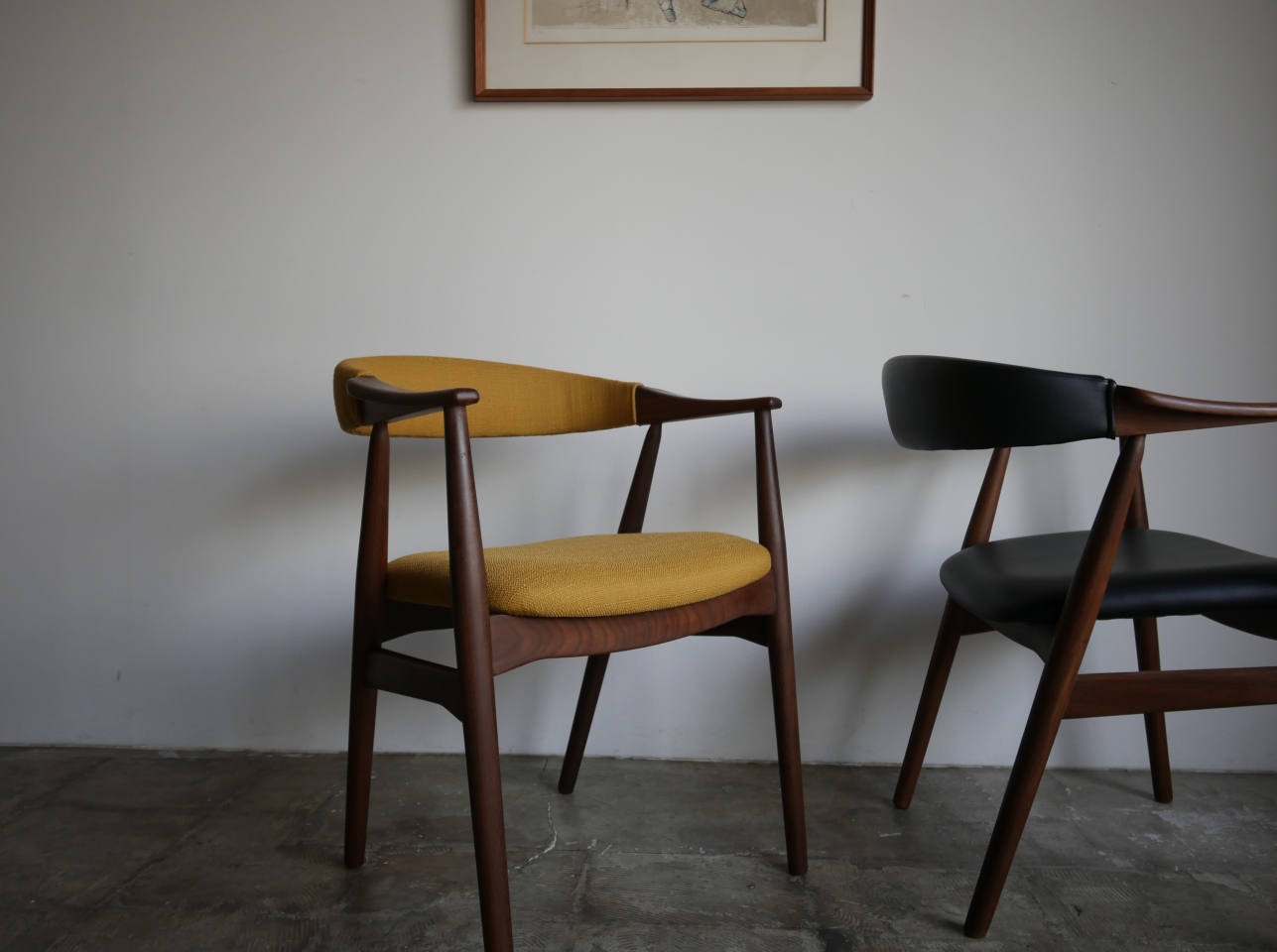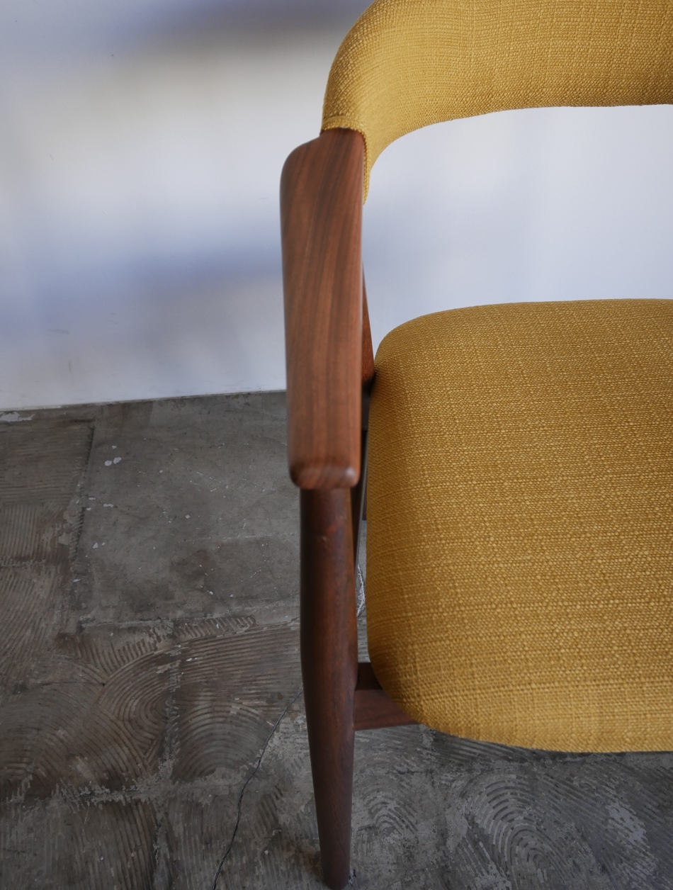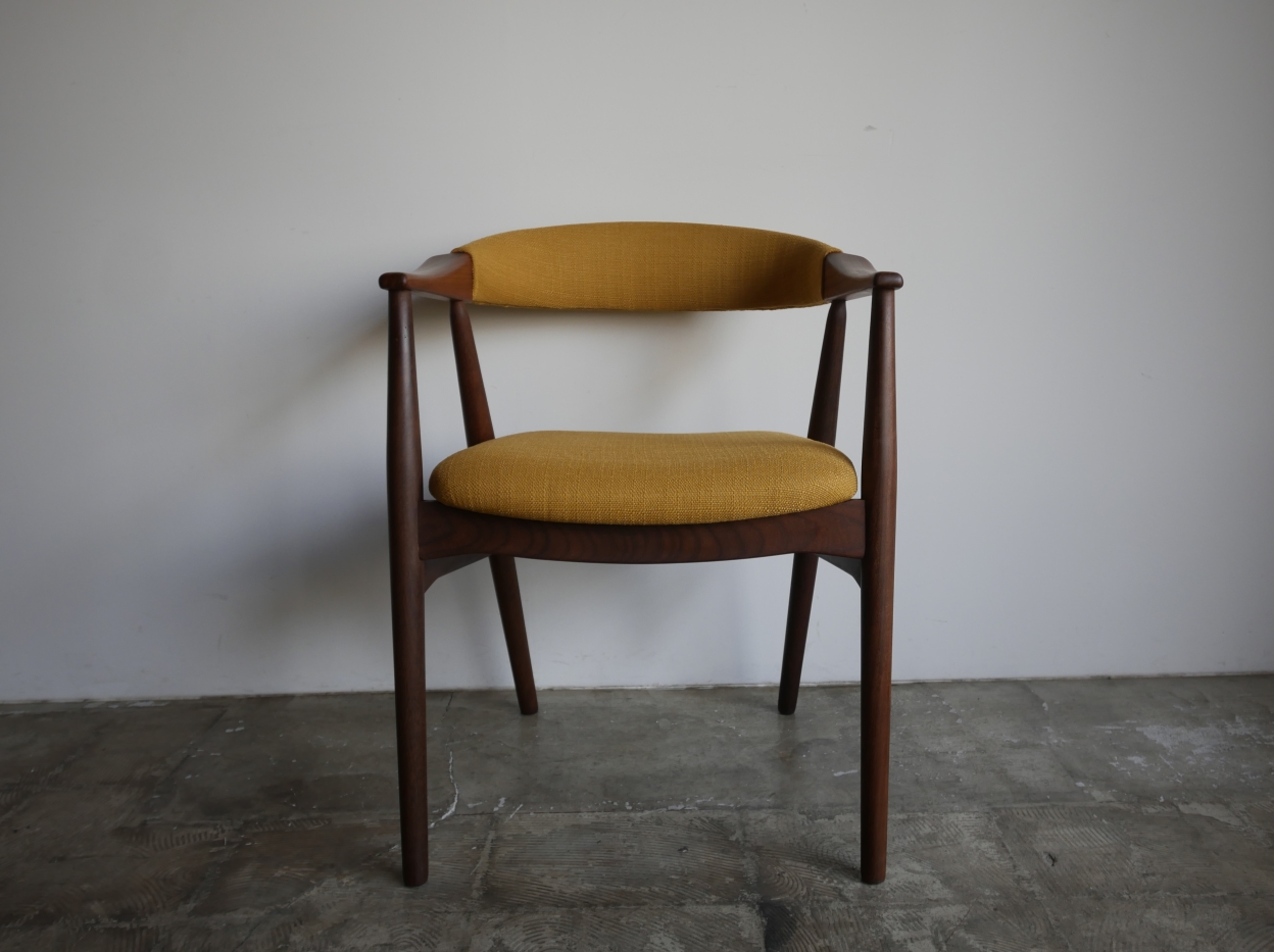 Thomas Harlev デザイン、Fastrup社製アームチェア、 背もたれからアームまで一体となったシャープなフォルムが特徴です。 材質はアフロルモシア(アフリカンチーク)です。 張地はイギリスClarke & Clarke社製、肌触りの良い マスタードカラーの生地で張替済み。 ウレタンも新規交換済み、フレーム は古い塗装を剥離後に、オイルで再塗装済み。 フルメンテナンス済みでの販売です。