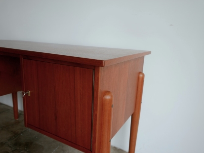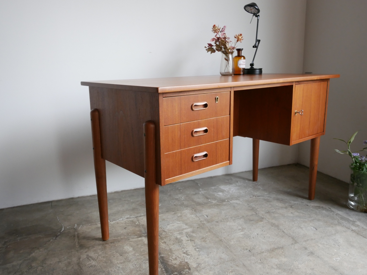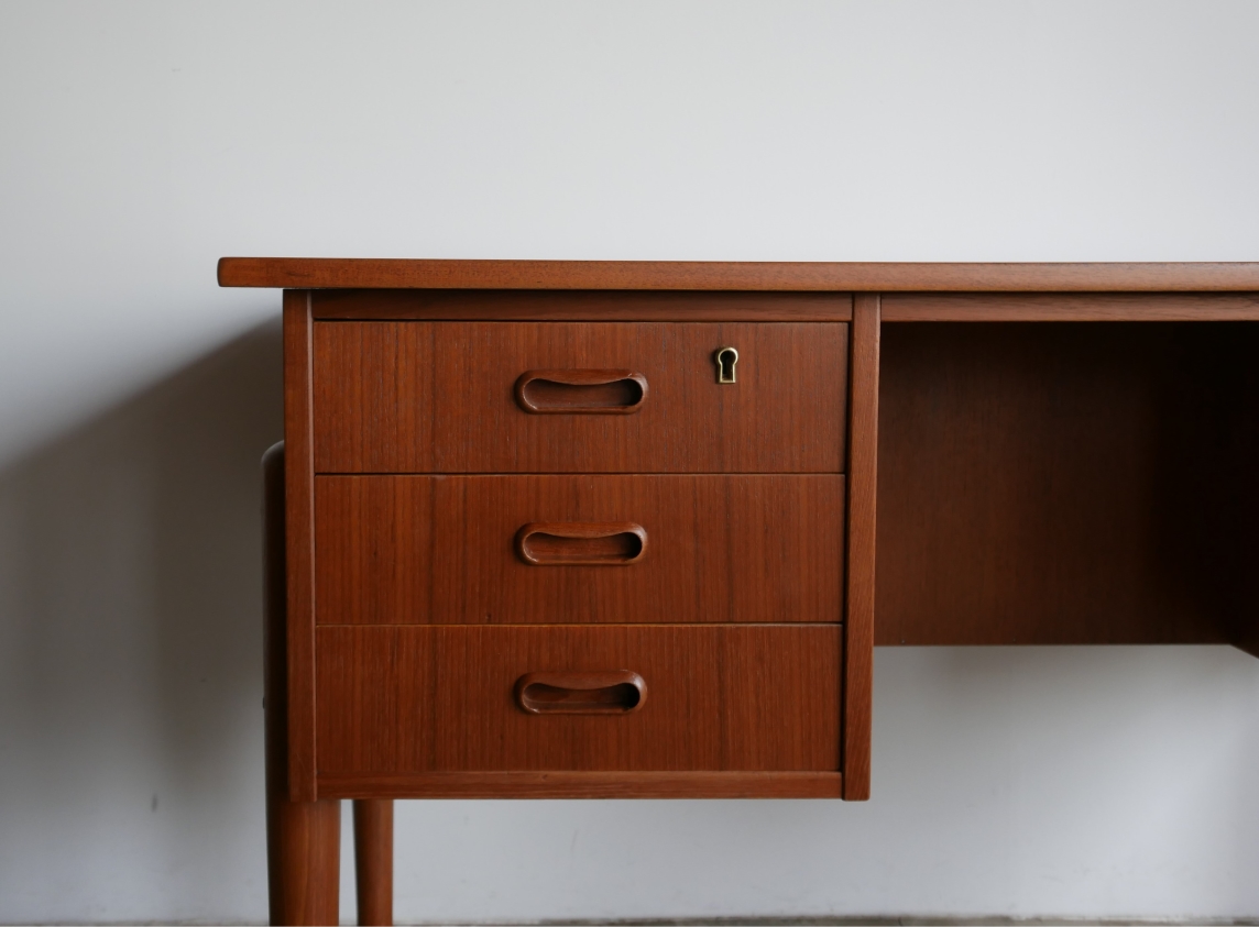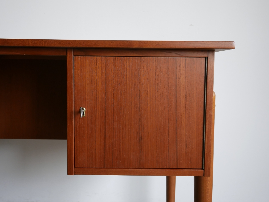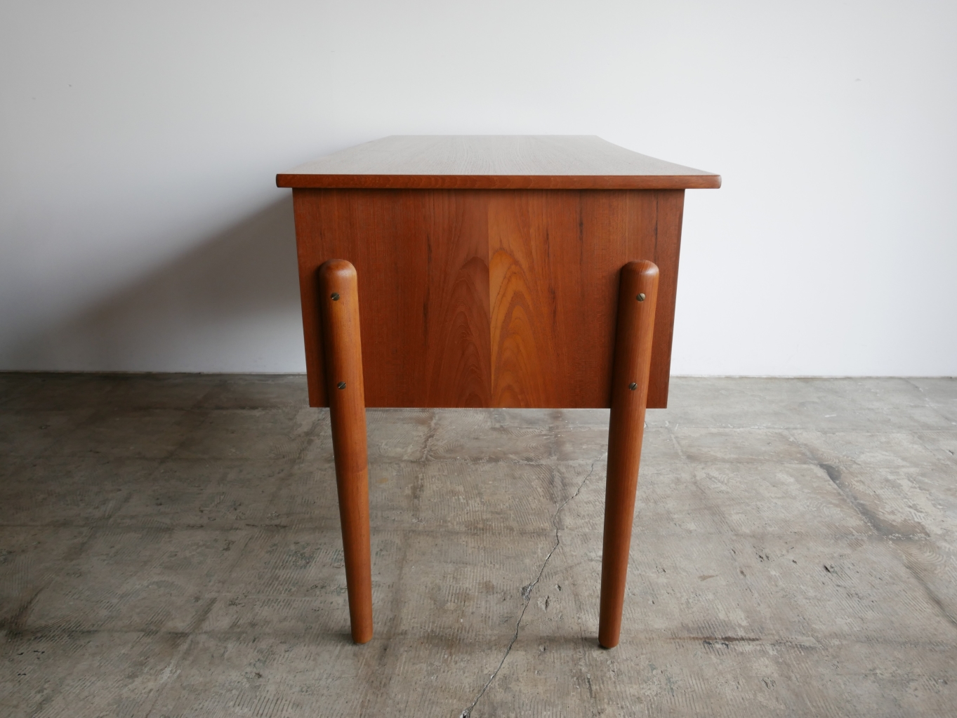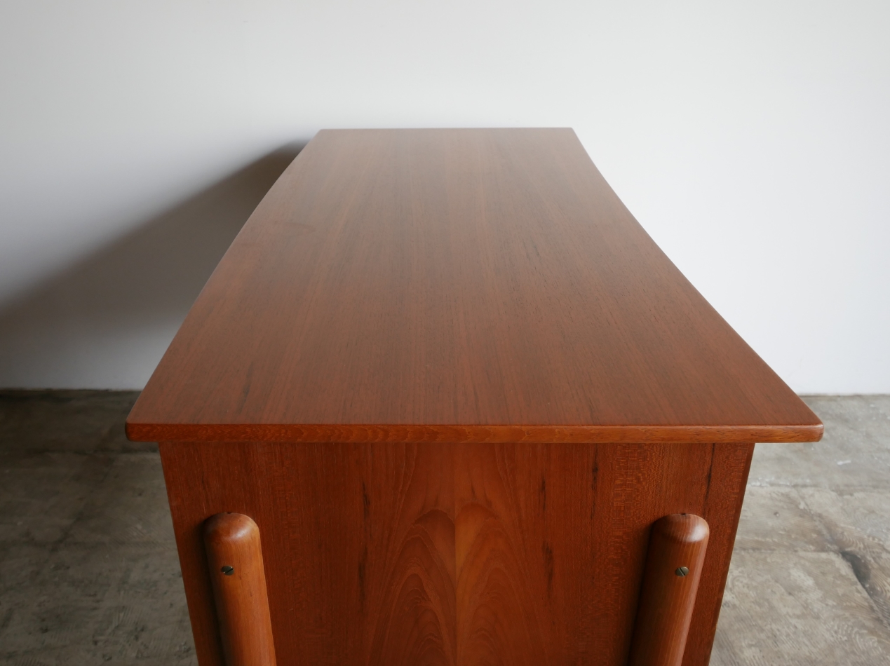 両サイドに張り出した脚部、弓なりにカーブした 天板とデザインが高いデンマーク製両袖デスクです。 材質はチーク材、背面に収納飾り棚があり、壁を背に した配置も可能です。