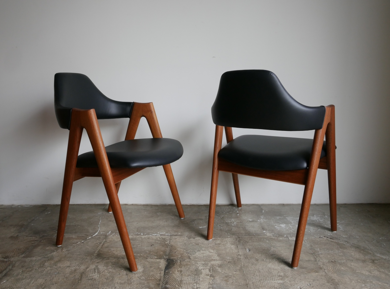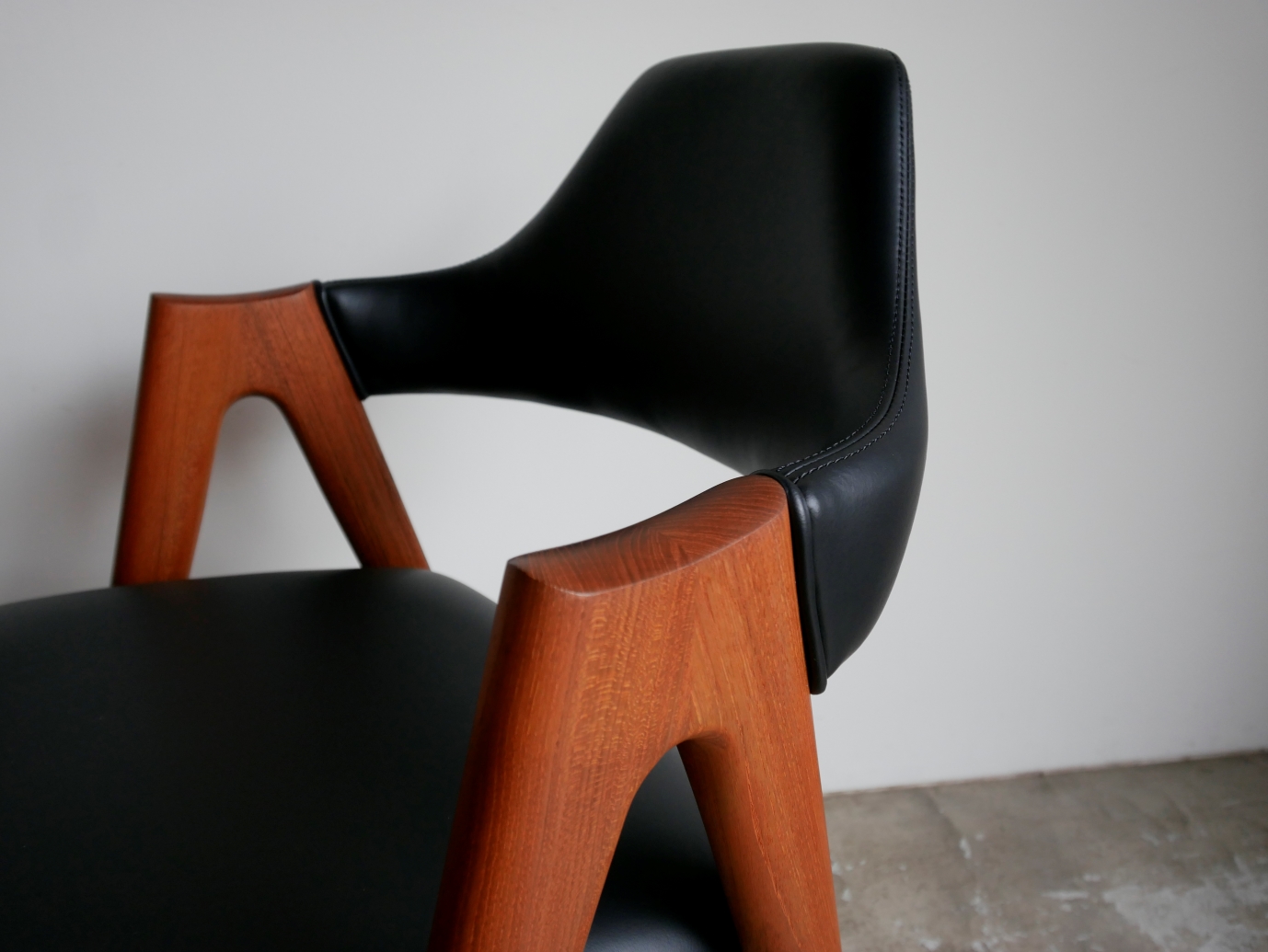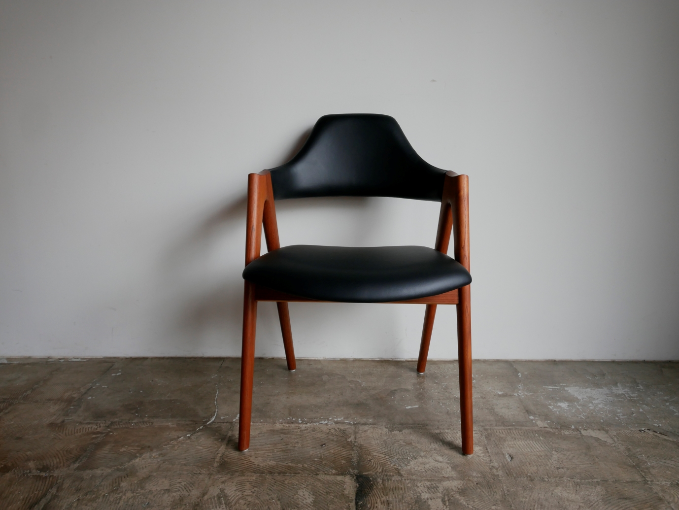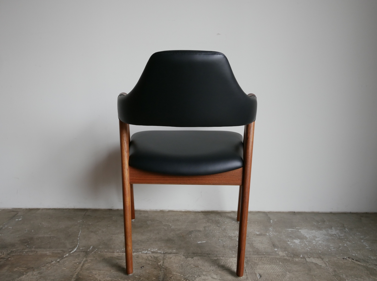カイクリスチャンデザイン コンパスチェア コンパスのような脚の形状が特徴で通称コンパスチェアと 呼ばれています。前後脚が肘の高さまで延びジョイント部分 がひじ掛けになる意匠性の高いデザインのアームチェアです。 緩やかにラウンドした背もたれは背中にやさしくフィットし 弾力のある座面は長時間使用しても疲れにくい 良質のウレタンを使用しています。 材質はチーク材、 古い塗装はすべて剥離し、オイル+ワックス で再塗装し牛革スムースで張替済みです。 座面の高さ44㎝ Designer: Kai Kristiansen manufacture: SVA Mobler made in Denmark