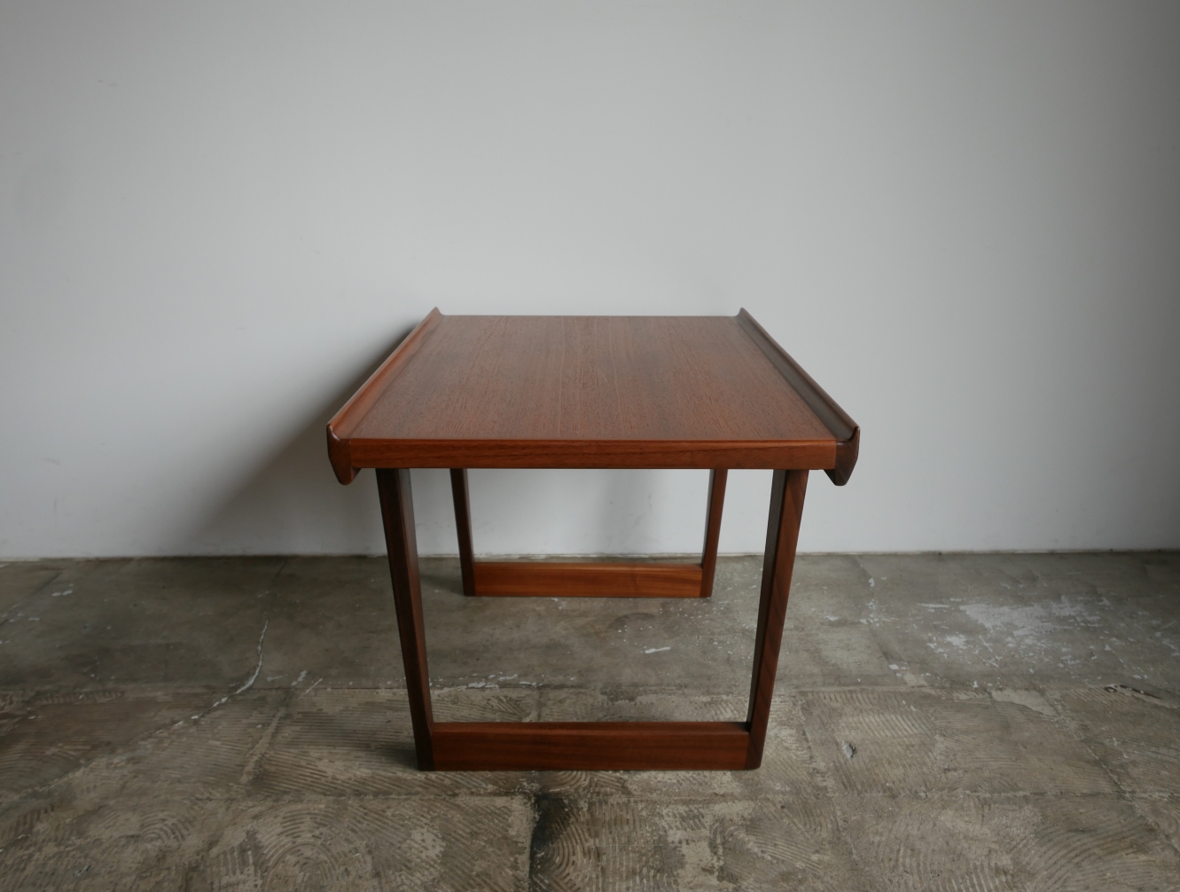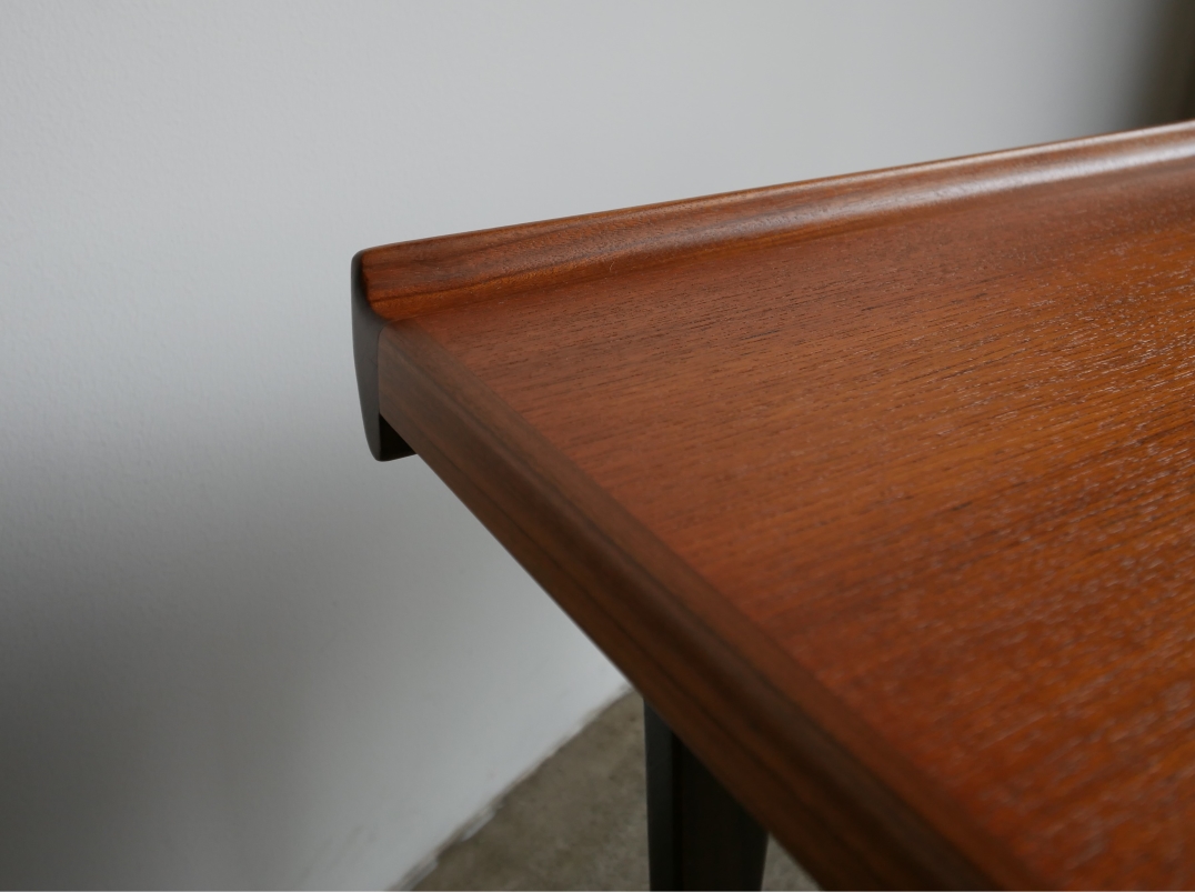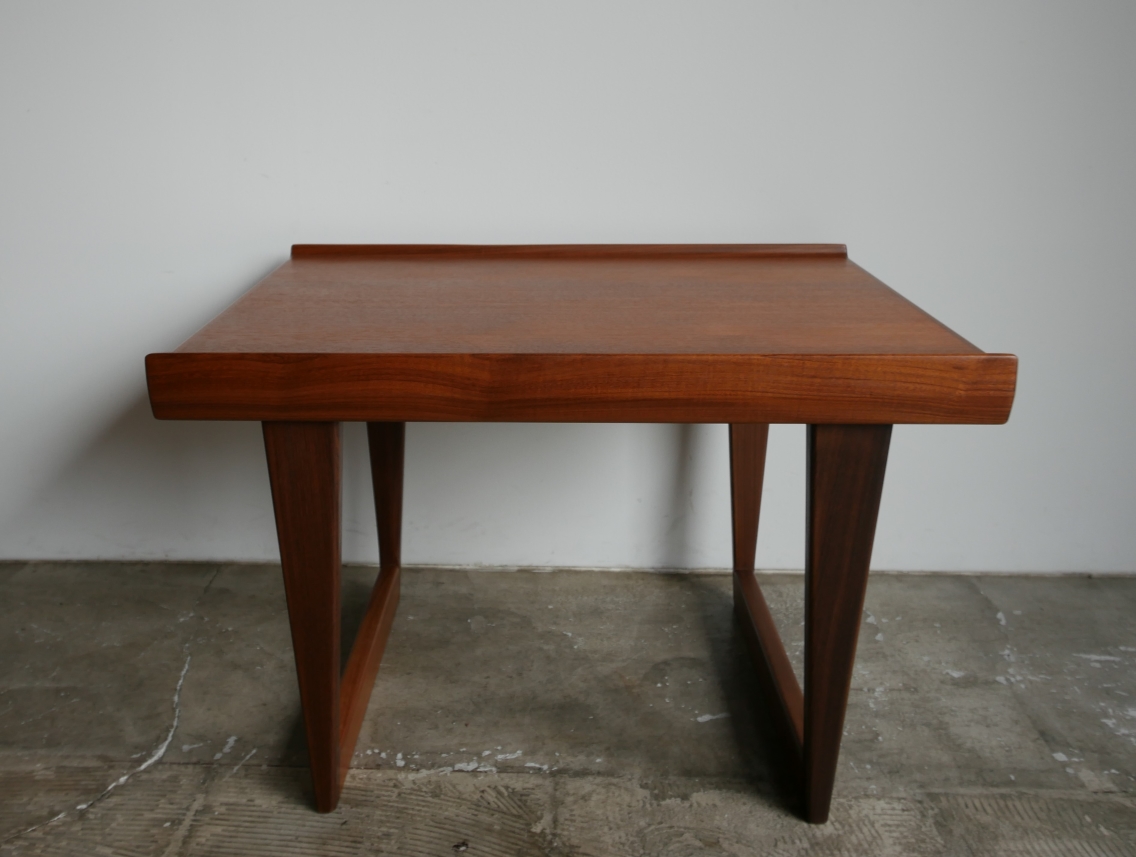 1966年Peter Lovig Nielsen デザイン、 両サイドの筆返しとシャープなラインの脚部デザイン が特徴のサイドテーブルです。材質は天板チーク材、 脚部アフロモシア、古い塗装を全面剥離後に水拭き 可能な艶抑え目のラッカー塗装で再塗装仕上げしています。 ソファサイド、ベッドサイド、エントランスなどに お薦めです。
