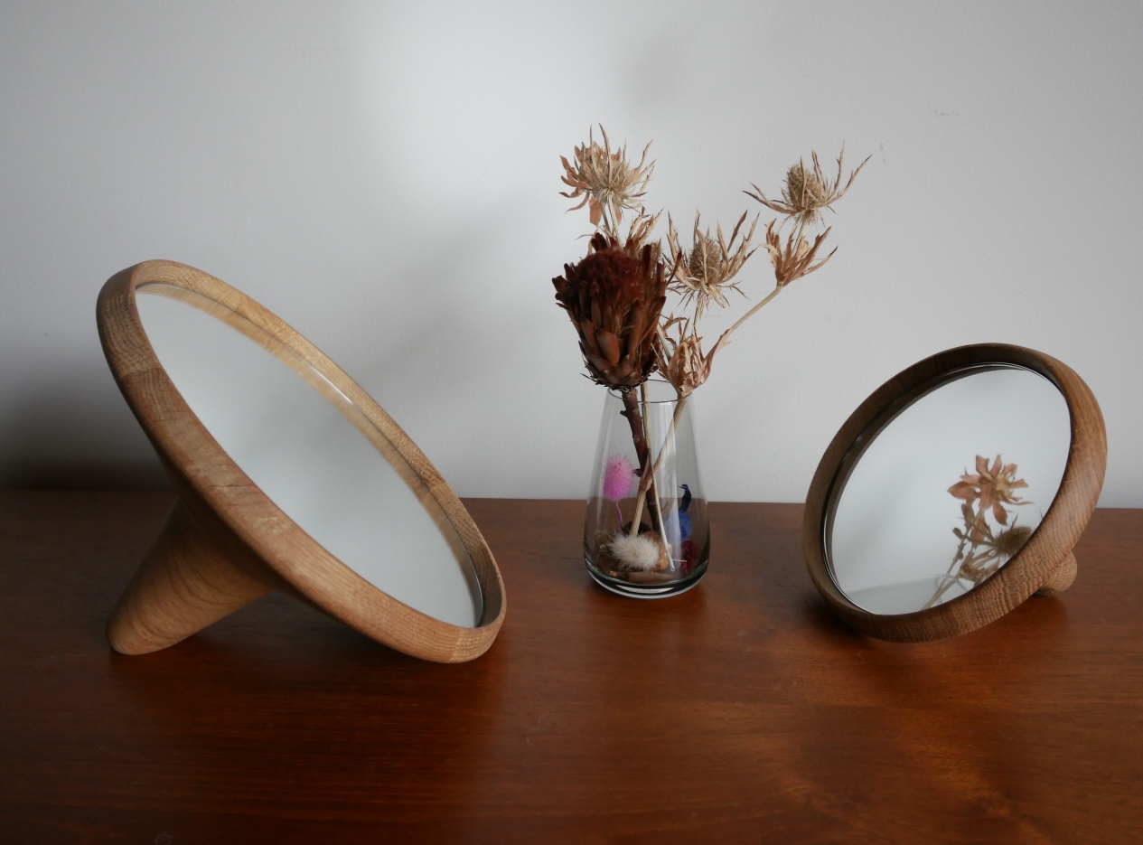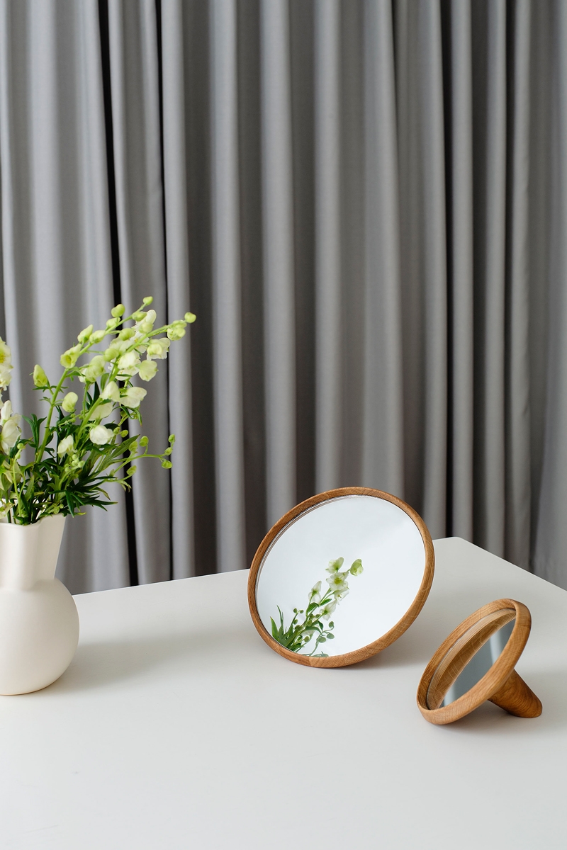 Spring Copenhagen社製 オイル仕上げのオーク材で 縁取られた丸型ハンドミラーです。サイズは直径16㎝の Sサイズ、直径24㎝のLサイズの2サイズ展開です。 ミラーのハンドル部分がスタンドとしても機能し、 持ち運びしやすく機能的で美しいオーガニックシェイプ デザインです。お化粧台やベッドサイド、デスク、 玄関にもお薦めです。