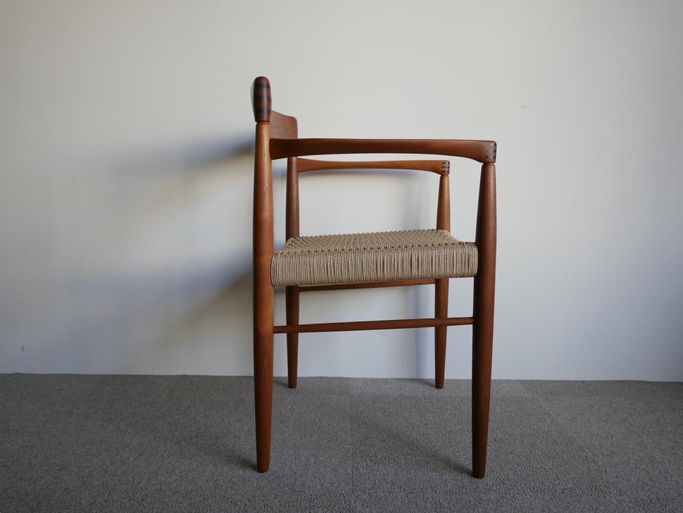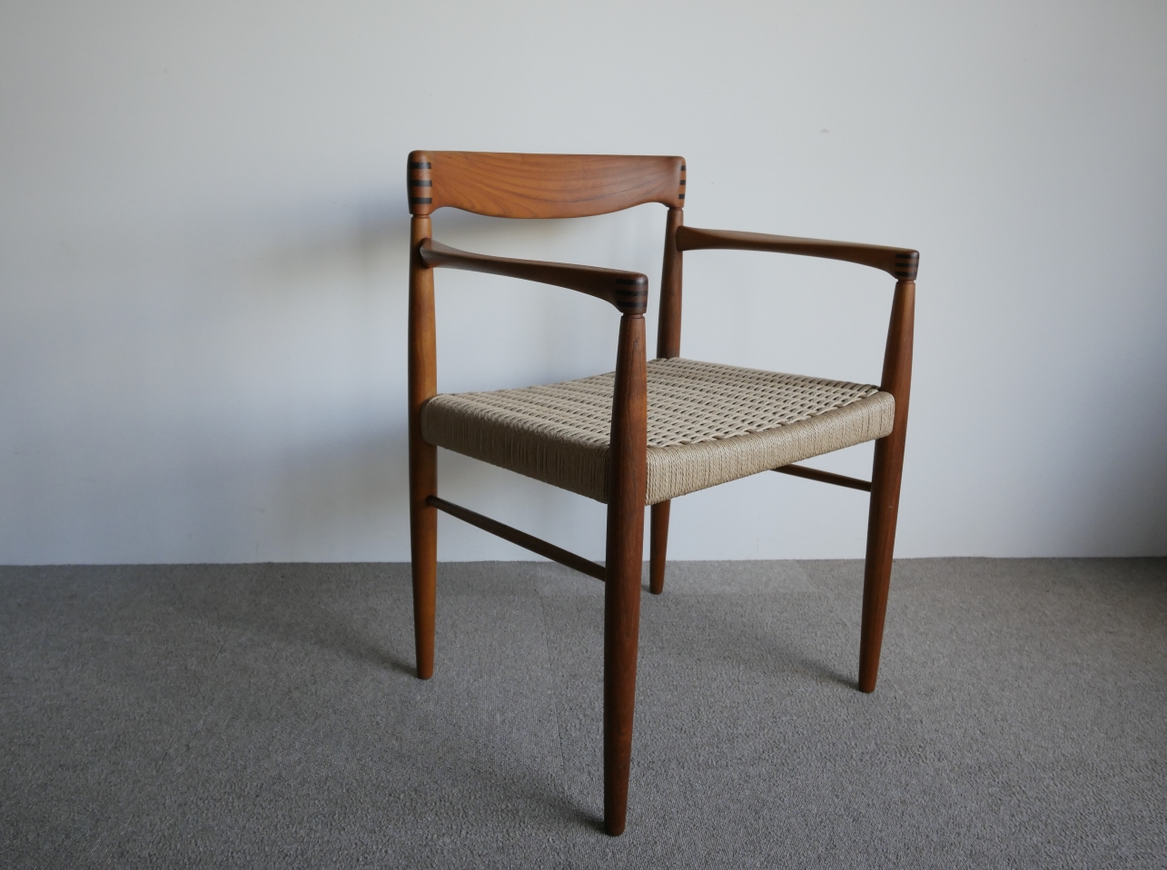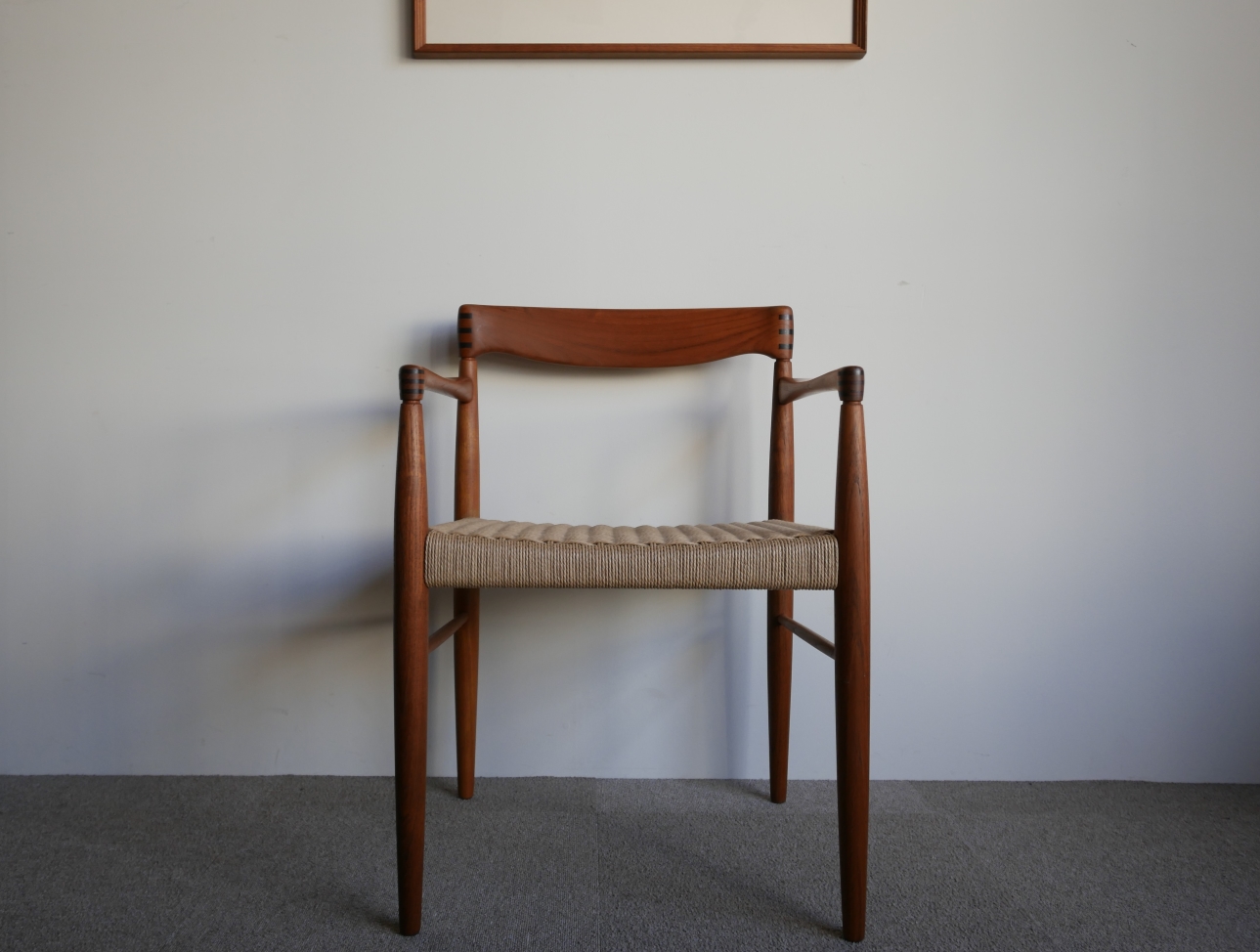 H.W Klein(ヘンリーウォルタークレイン)デザイン、Bramin社製の アームチェアです。材質はチーク材、背もたれ、アームの有機的で しなやかなフォルムが特徴です。アーム先、背もたれコーナーの ローズウッドのインレイがアクセントとして効いています。 古い塗装を全面剥離後にオイル仕上げで再塗装済みです。 座面のペーパーコードは新規張替済み。