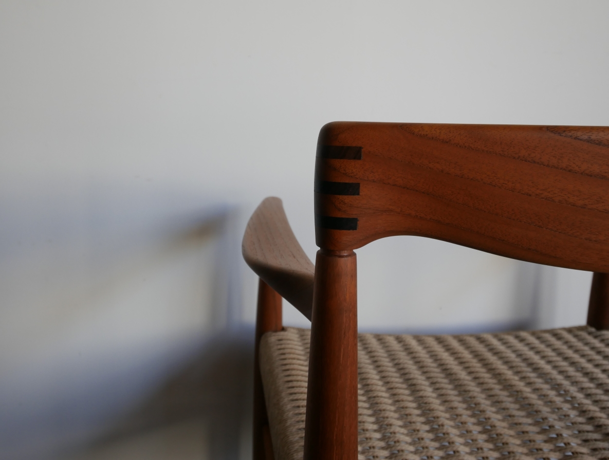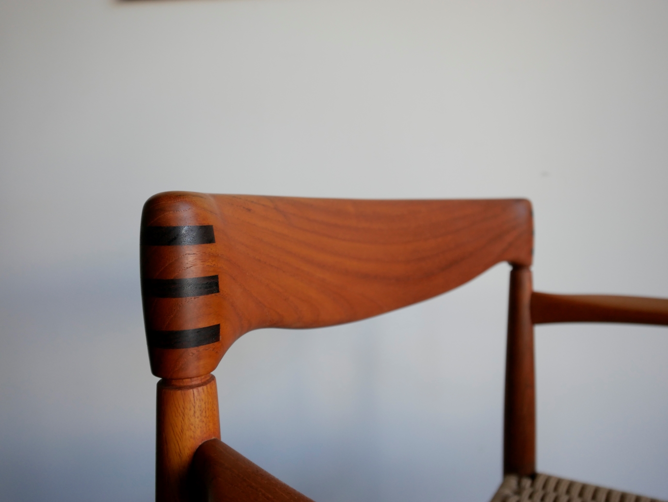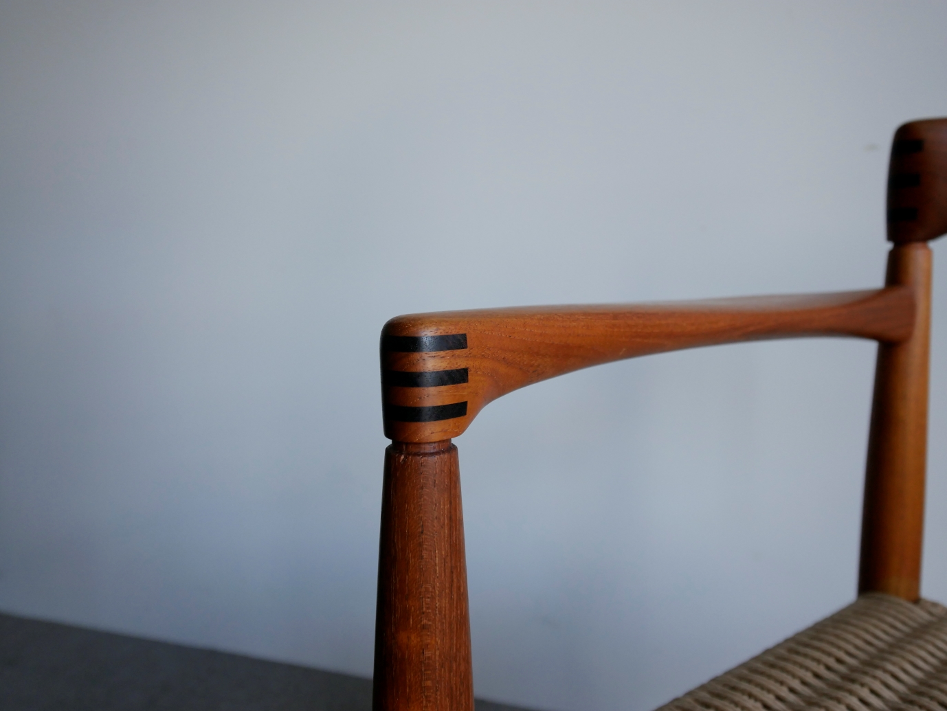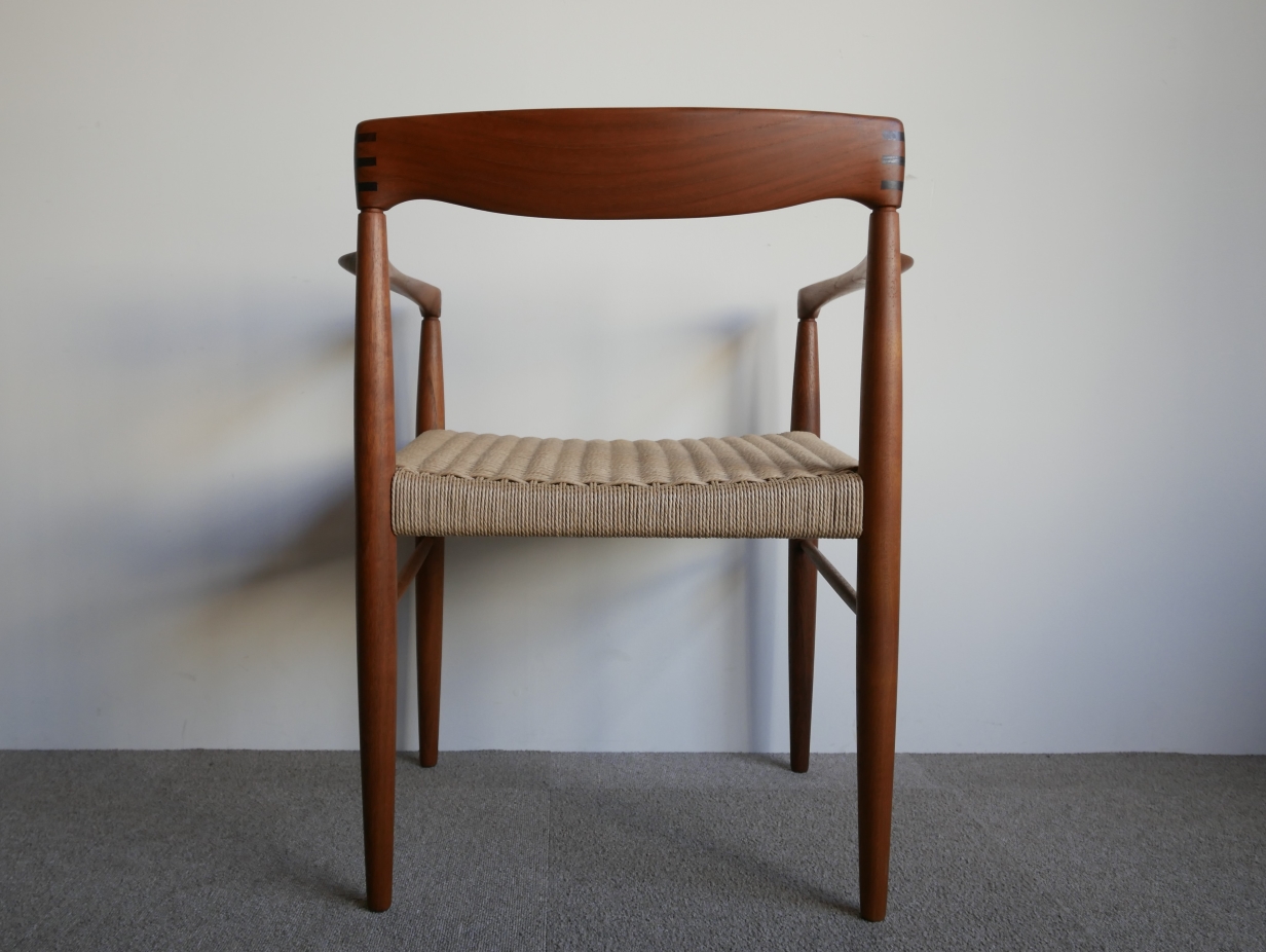 H.W Klein(ヘンリーウォルタークレイン)デザイン、Bramin社製の アームチェアです。材質はチーク材、背もたれ、アームの有機的で しなやかなフォルムが特徴です。アーム先、背もたれコーナーの ローズウッドのインレイがアクセントとして効いています。 古い塗装を全面剥離後にオイル仕上げで再塗装済みです。 座面のペーパーコードは新規張替済み。