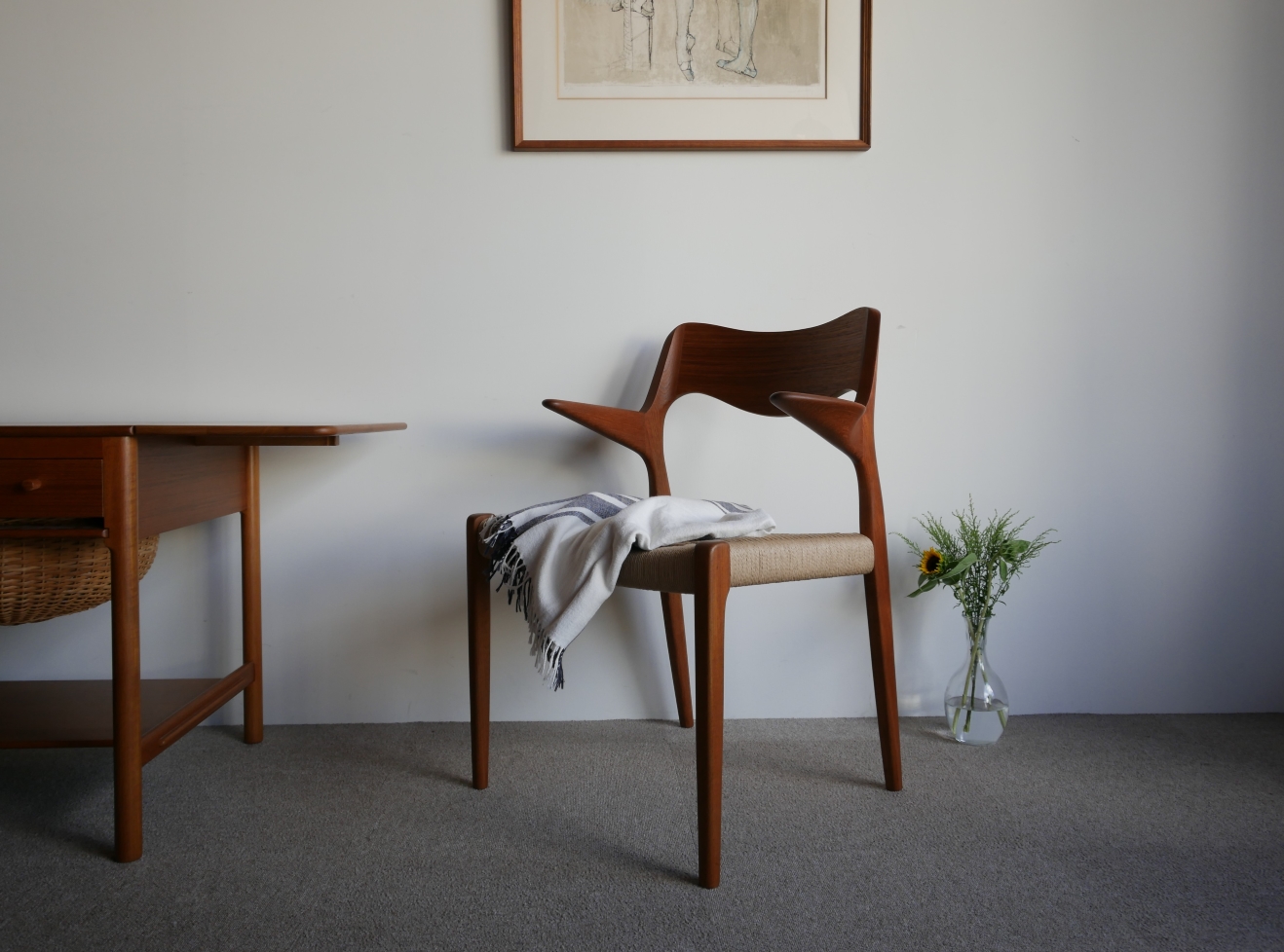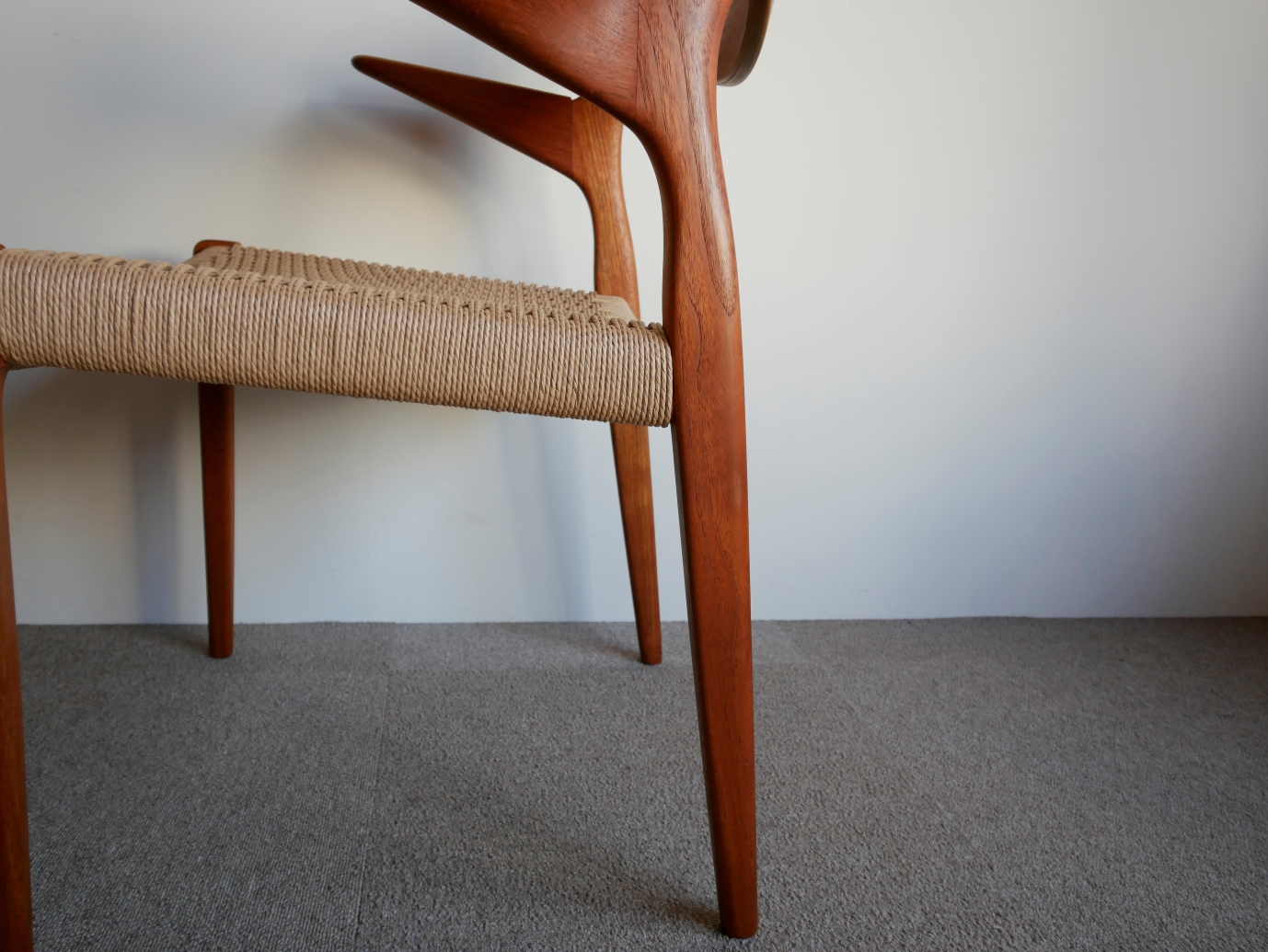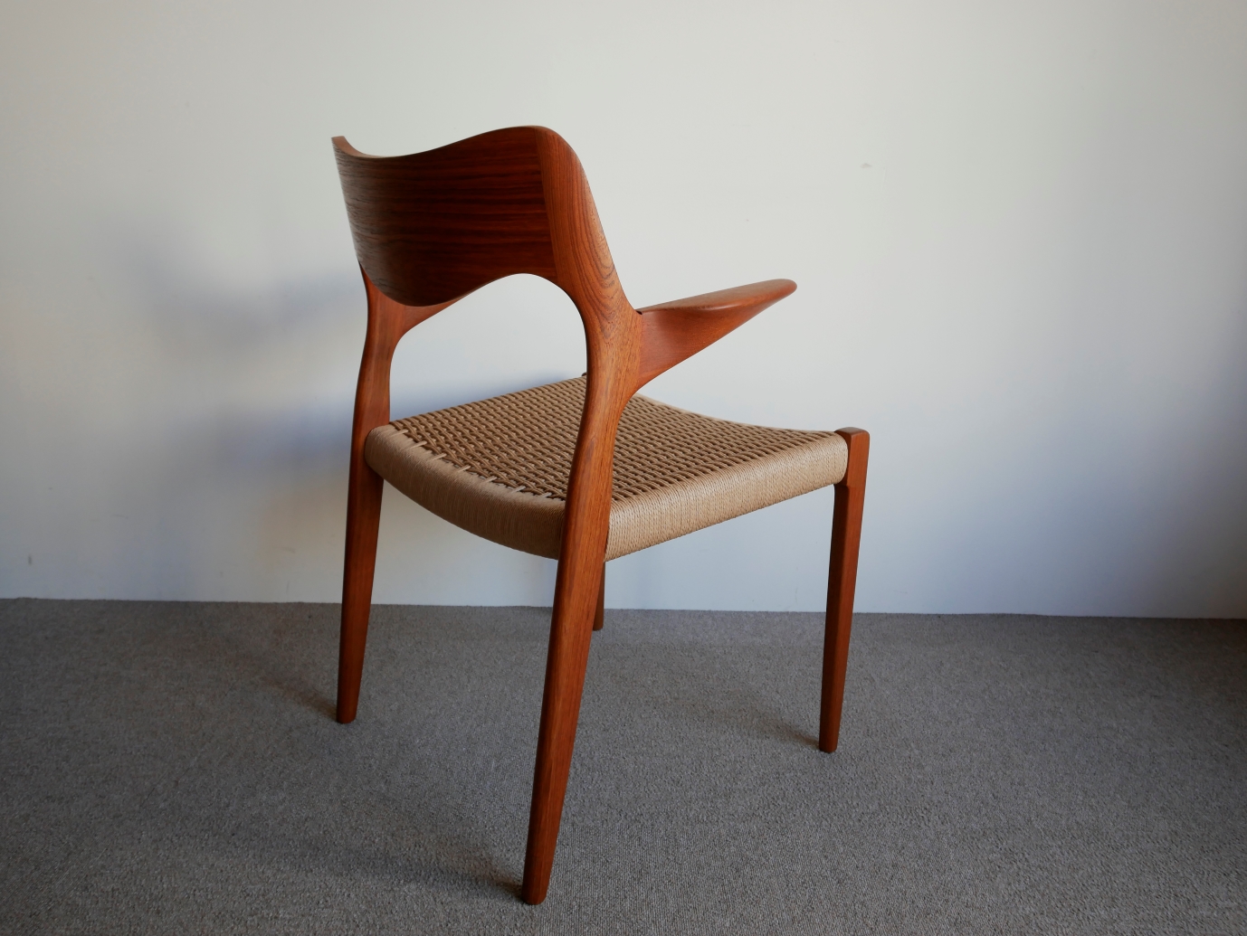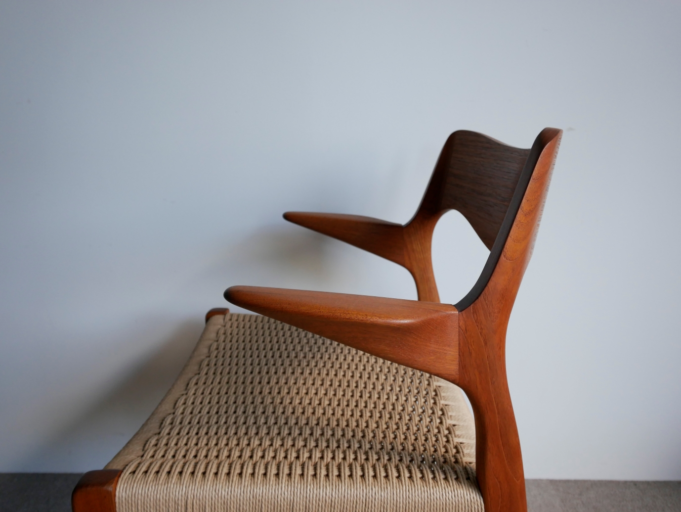 1951年にNO.71 アームレスチェアとともにリリースされた モデルNO.55。波打つようなフォルムの背もたれ、 背と一体化した後ろ脚のデザイン、ボリュームのあるオーガニック シェイプのショートアームデザインが特徴です。材質はチークです。