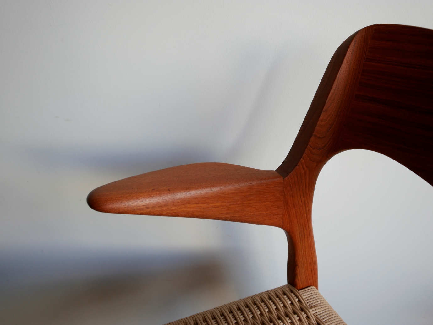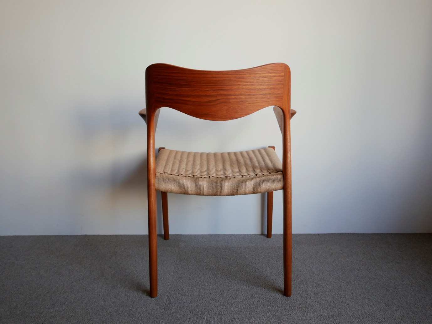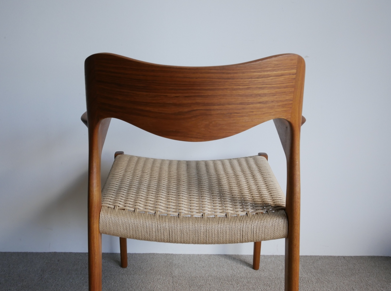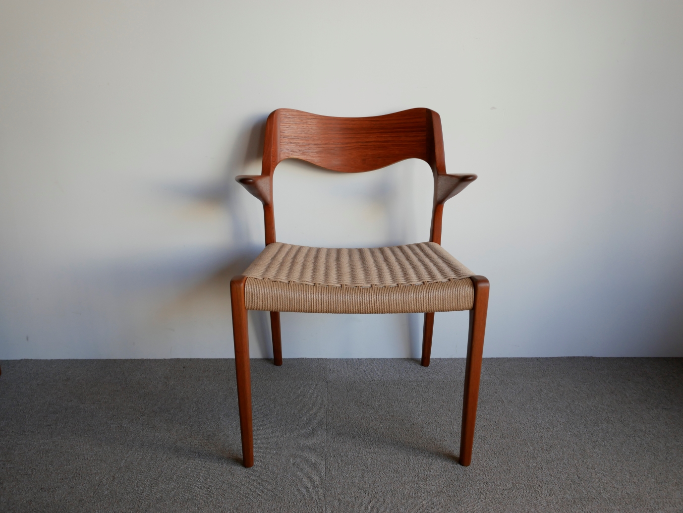 1951年にNO.71 アームレスチェアとともにリリースされた モデルNO.55。波打つようなフォルムの背もたれ、 背と一体化した後ろ脚のデザイン、ボリュームのあるオーガニック シェイプのショートアームデザインが特徴です。材質はチークです。