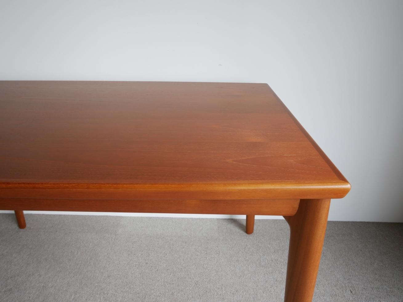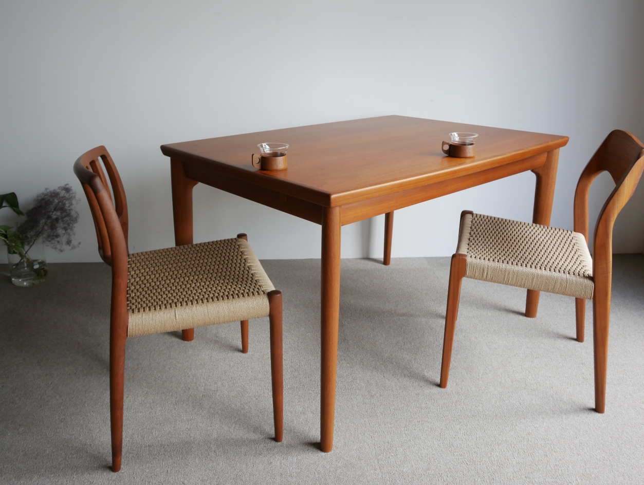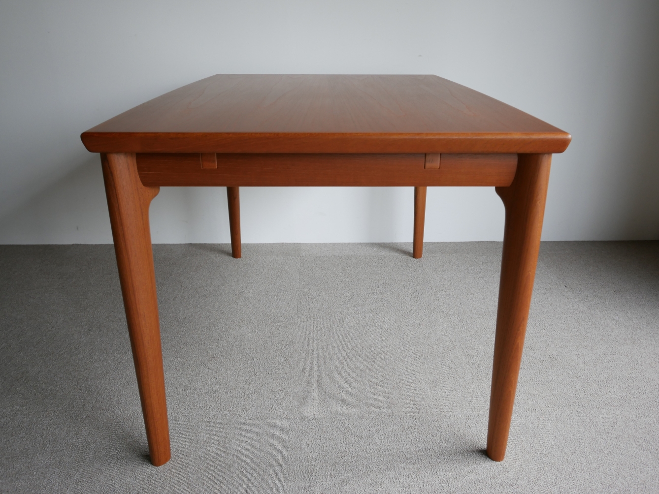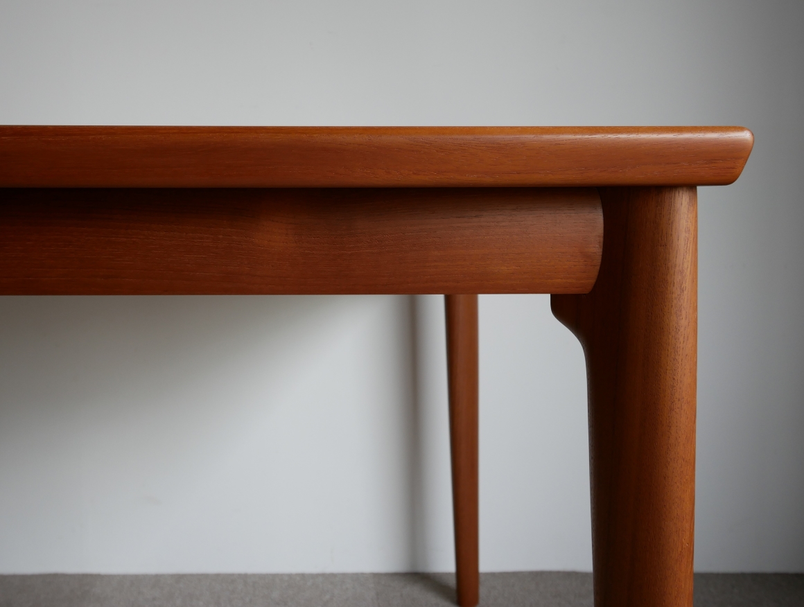 両サイドから中央に向かい緩やかに弧を描く天板、 テーパードラインの脚、天板下に収納され外観からは 解らないように工夫された隠ぺい式のエクステンション、 気遣いが細部に感じられる美しいテーブルです。