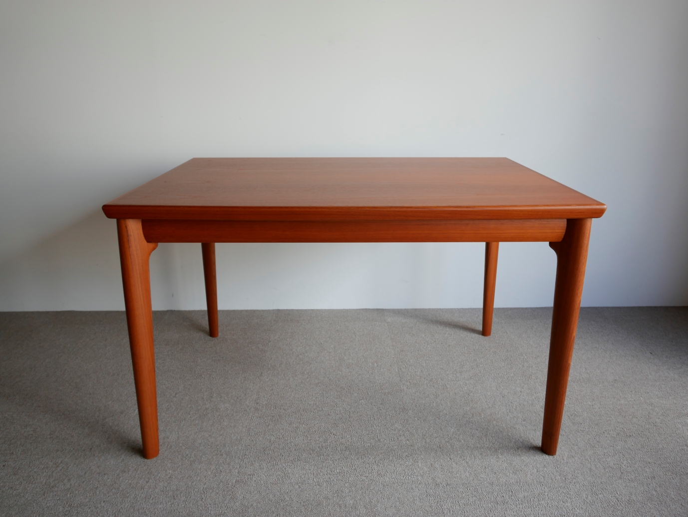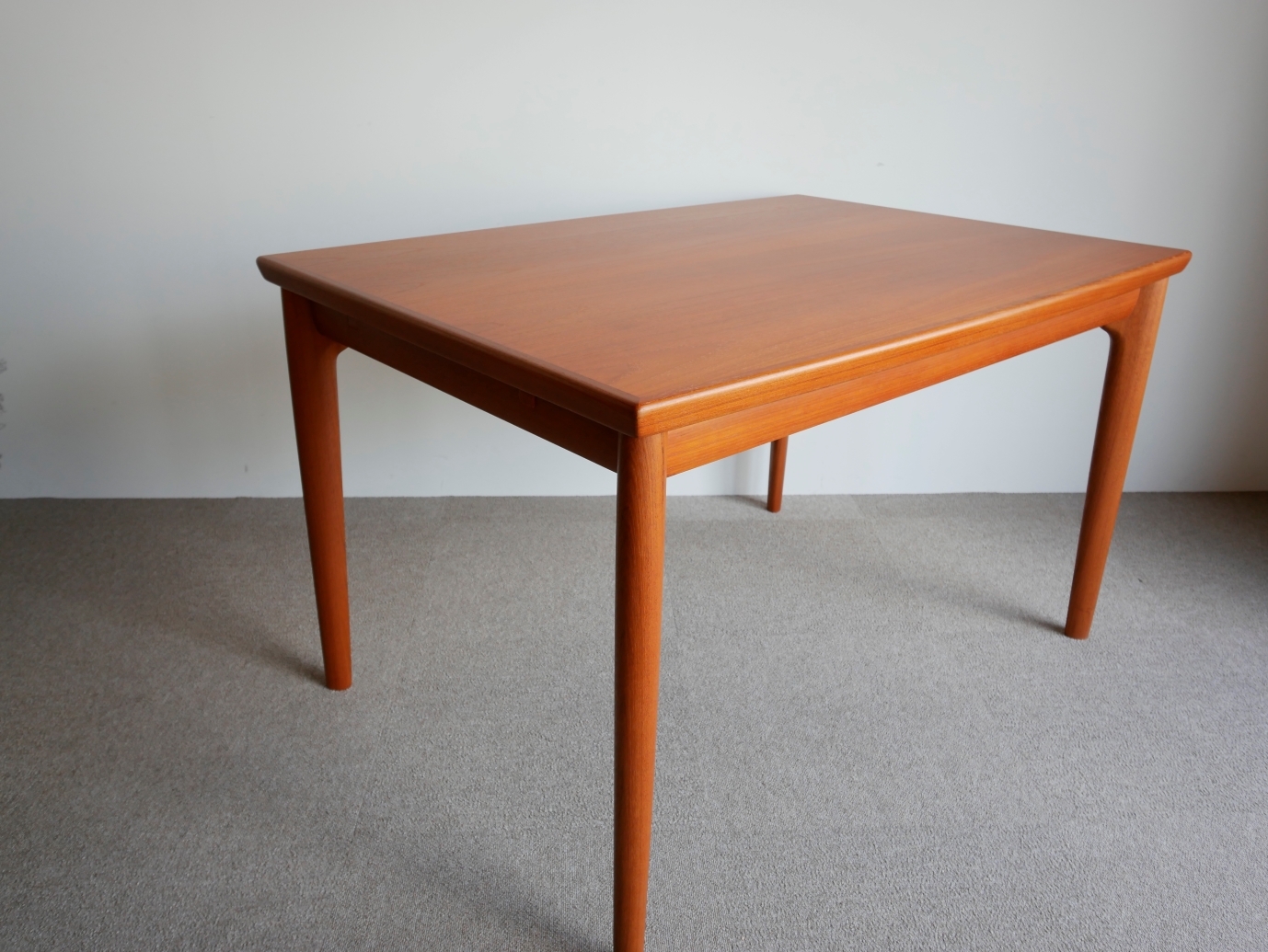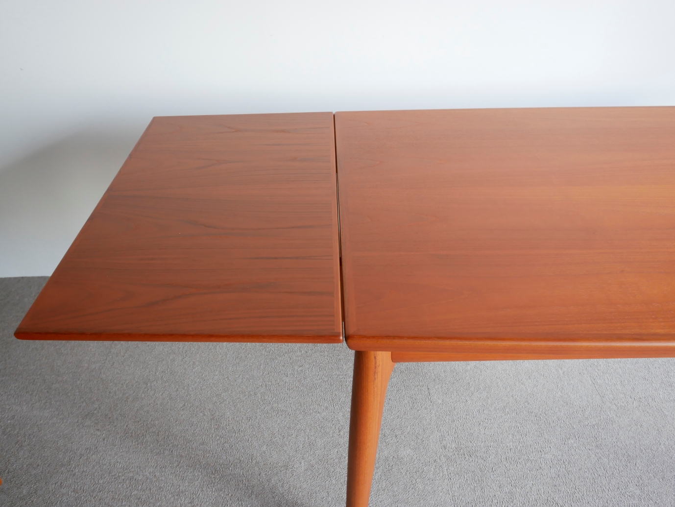 両サイドから中央に向かい緩やかに弧を描く天板、 テーパードラインの脚、天板下に収納され外観からは 解らないように工夫された隠ぺい式のエクステンション、 気遣いが細部に感じられる美しいテーブルです。