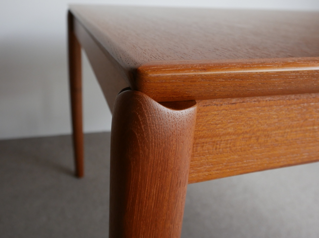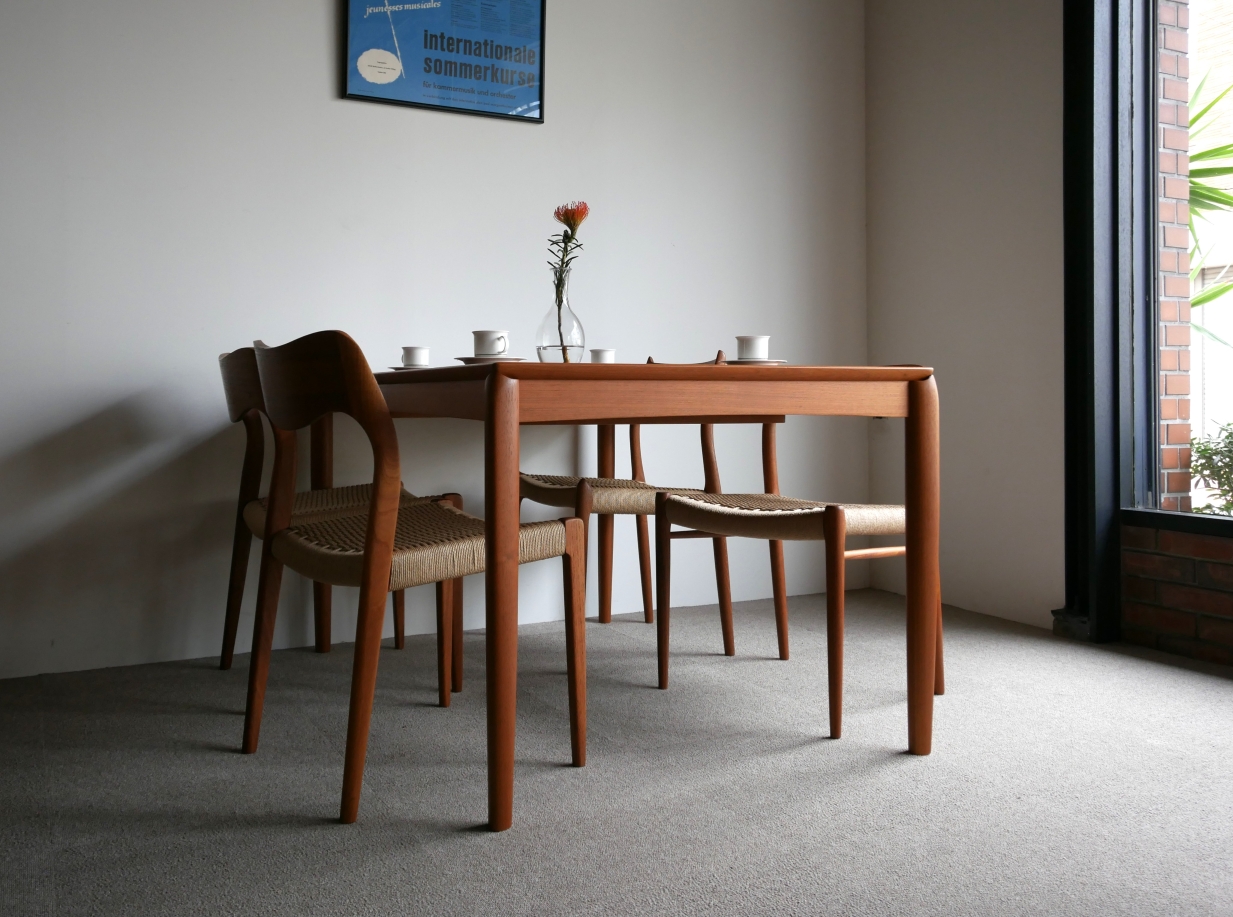 Henrry Walter Klein デザイン Bramin社製、脚部の オーガニックシェイプが特徴のダイニングテーブル、 材質はチーク材、古い塗装を全面剥離後にラッカー 塗装で再塗装仕上げしております。 天板中央が開閉し内蔵のリーフ使用し幅60㎝拡張します。
