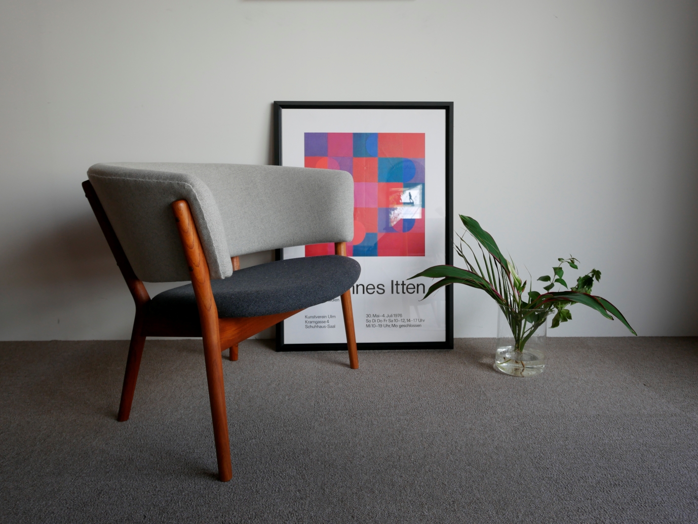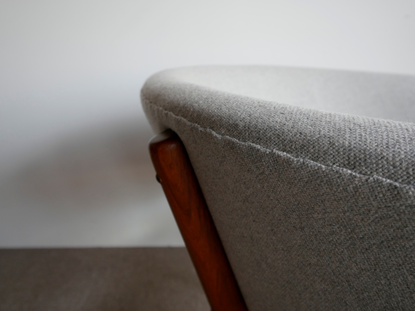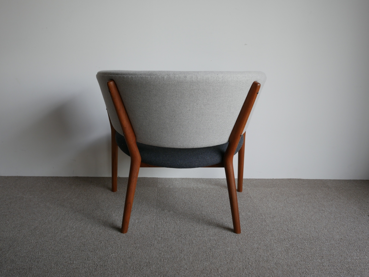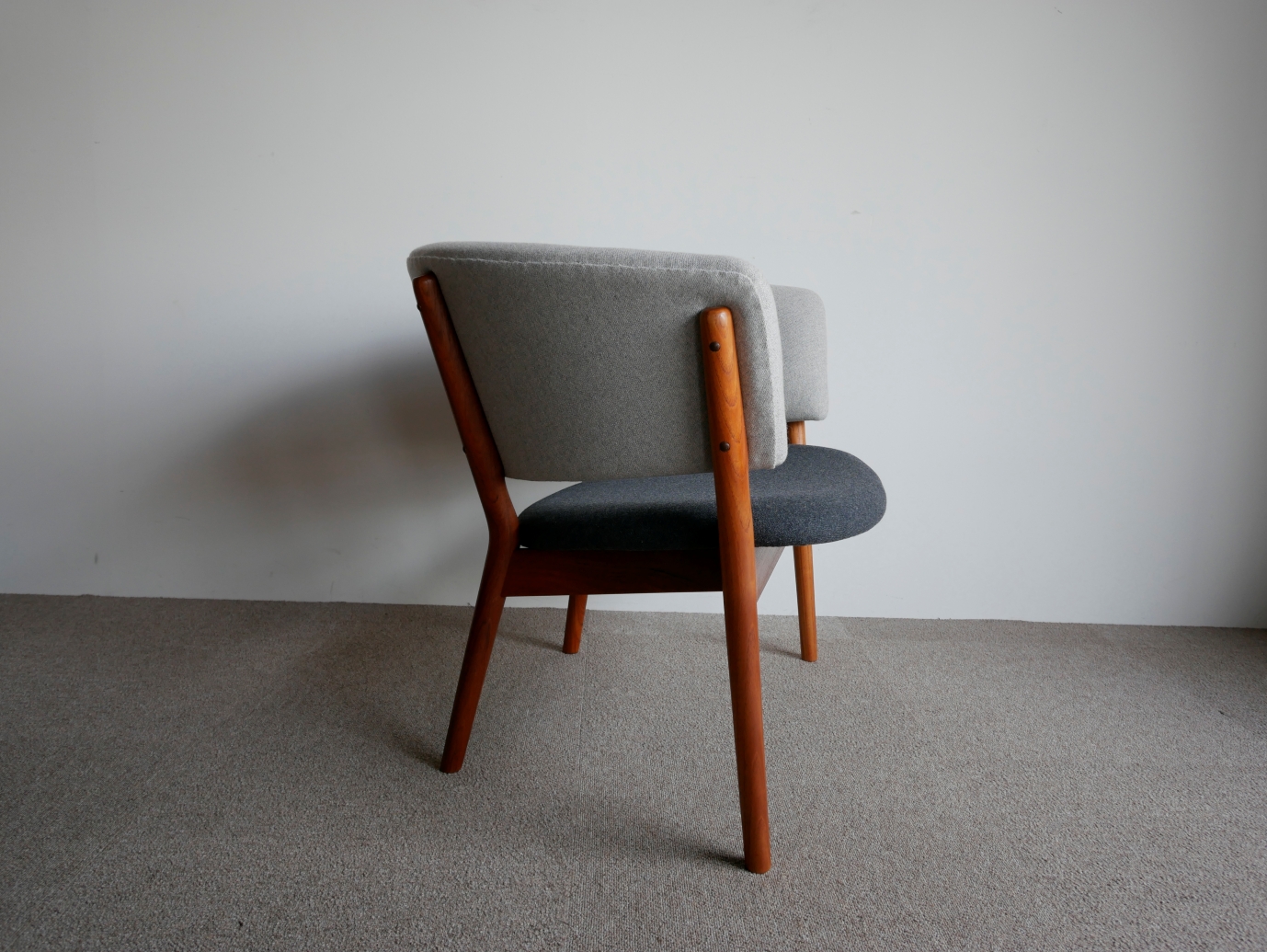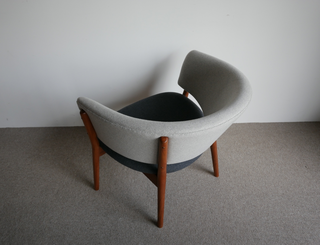 ナナ・ディツェル1952年デザインのNO.83チェア。 大きな弧を描く背凭れはゆったりと優しく体を包み込み ます。材質は希少なチーク仕様、古い塗装を剥離後に オイルで再塗装仕上げしています。 生地は国産の上質なウール高混率(WOOL70%,POLYESTER 30%)で 耐久性高いOLTAS社製生地で張り替えました。同素材の濃淡で座は チャコールグレー背はライトグレーで配色仕様となります。 また、背面は丁寧に手縫いで仕上げています。 座面高39.5㎝