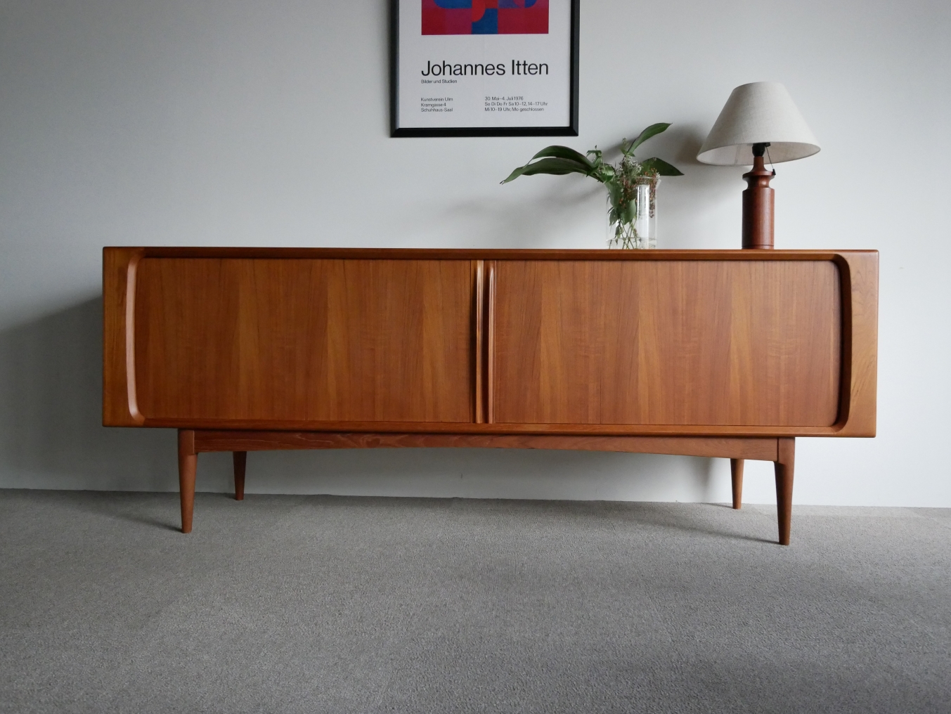 左右両サイドに収納される蛇腹式の扉が特徴の チーク材のサイドボード、1965年のデザインで Bernhard Pedersen & Son 社で製造。 扉の影に影響されない広々と明るく開放的な 収納部分は収納物を取りだしやすく、扉の飛び出しが ない分、道線を邪魔しない作りです。棚板3枚付属、 裏面もチーク材仕様、 全面再塗装済みです。