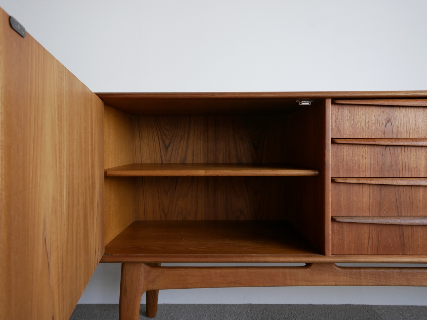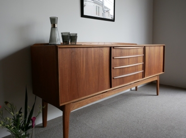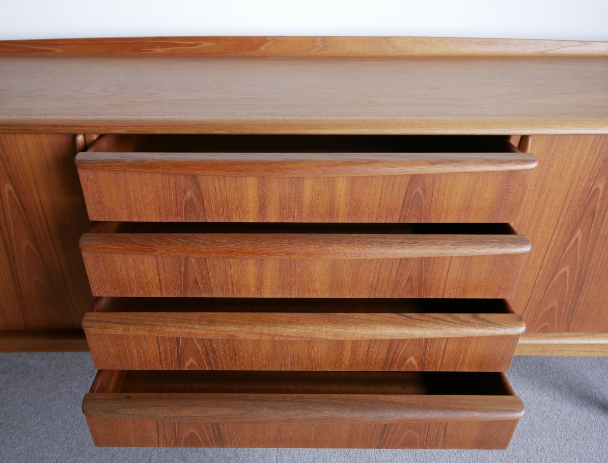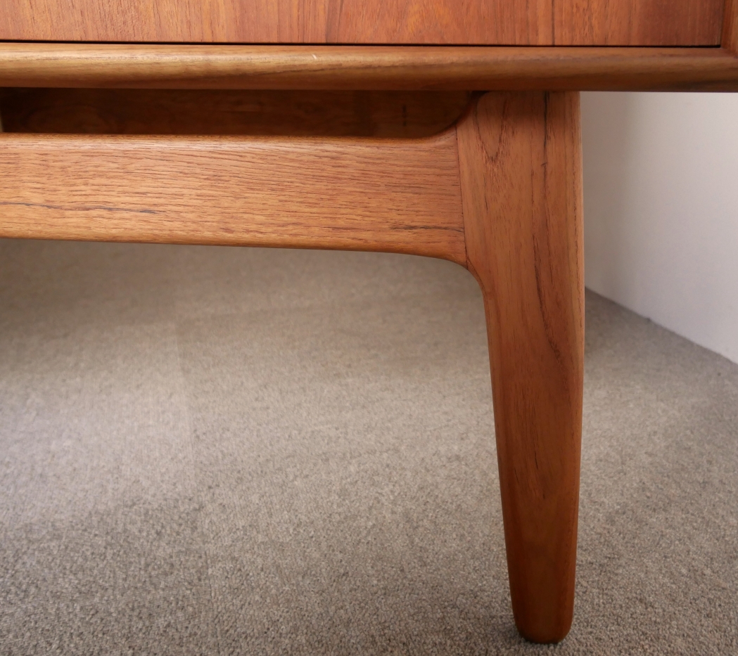 Svend Aage Madsen (スヴェンド・アジ・ マドセン) デザインのサイドボードです。天板周囲、ハンドル 脚にいたるまで丸みを強調したデザインが特徴、 天板の筆返しも滑らかなラインです。材質チーク材 古い塗装を剥離後に全面オイル仕上げで再塗装仕上げ済み 微光沢でしっとりとした仕上がりです。