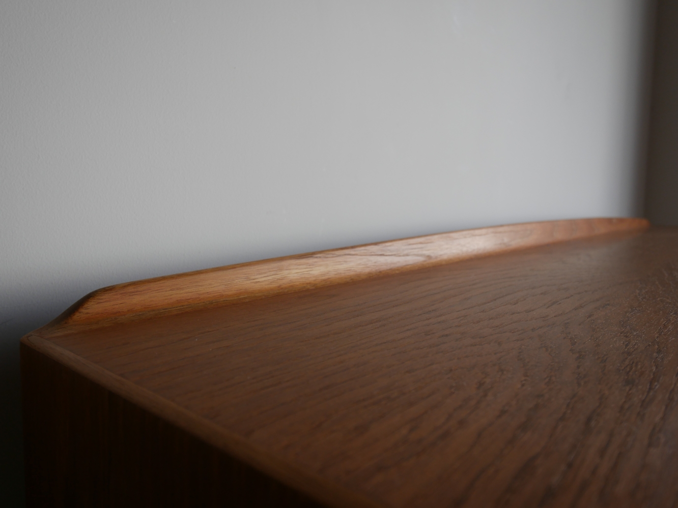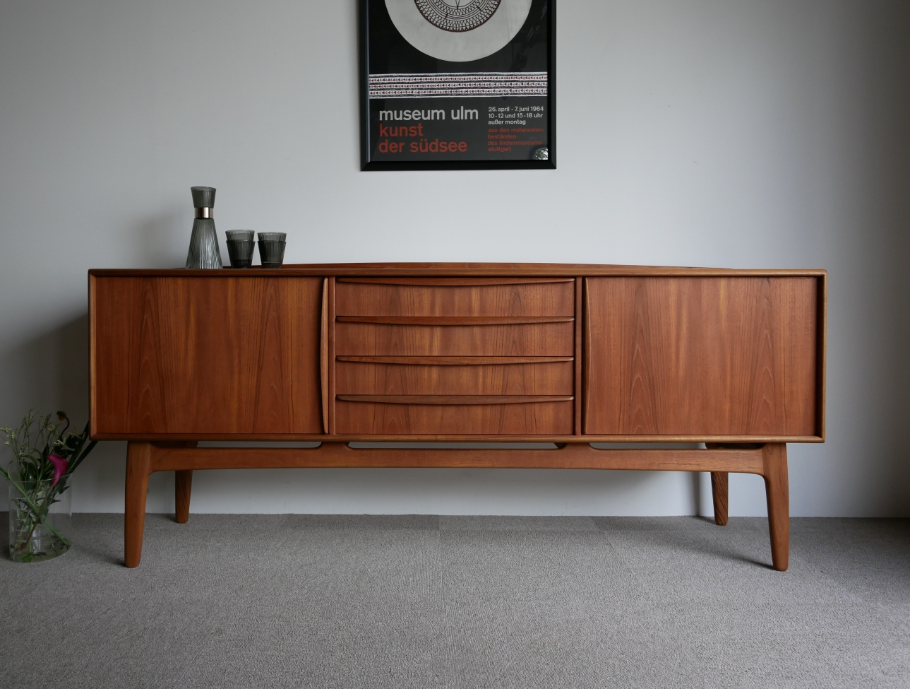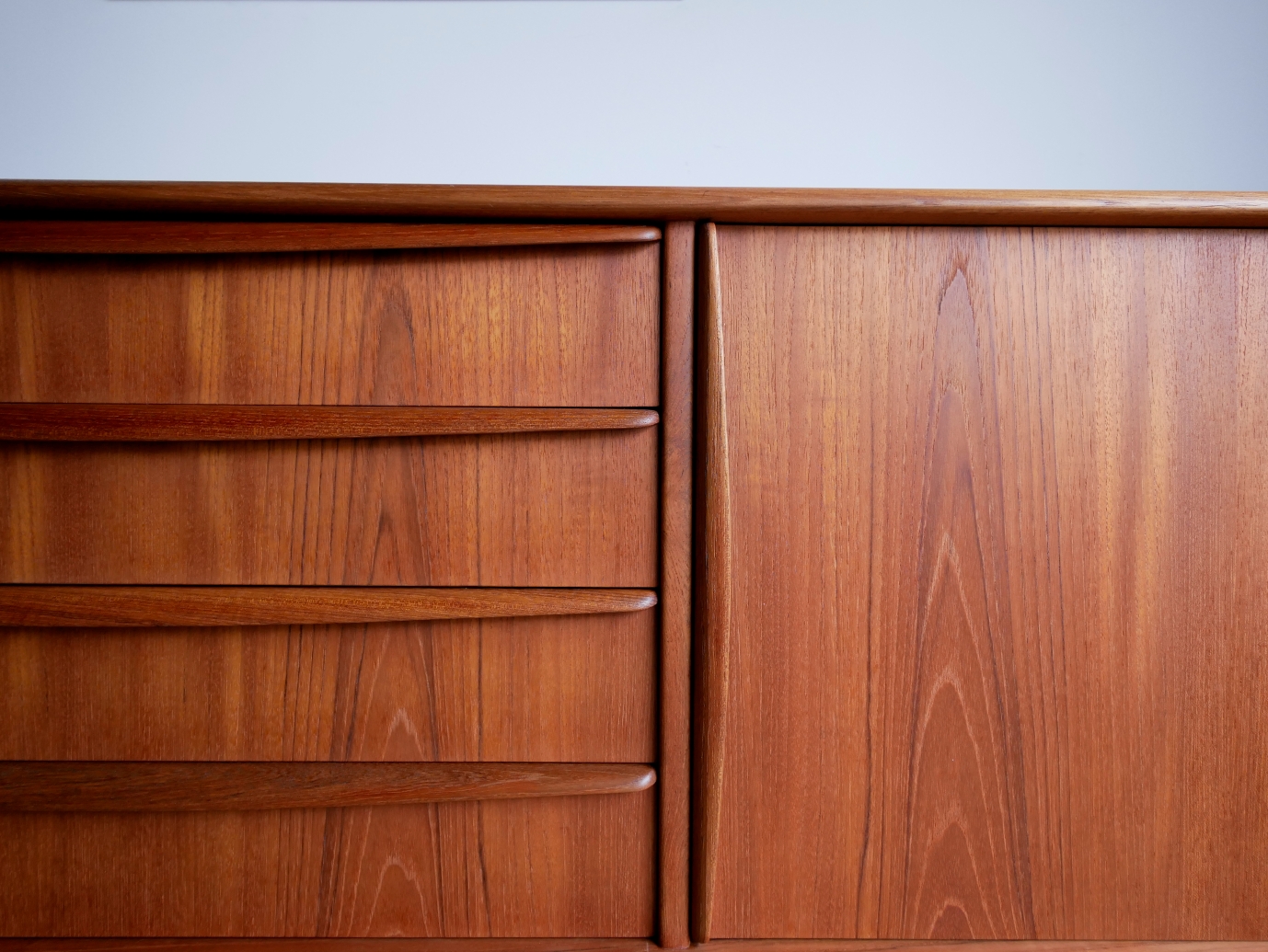 Svend Aage Madsen (スヴェンド・アジ・ マドセン) デザインのサイドボードです。天板周囲、ハンドル 脚にいたるまで丸みを強調したデザインが特徴、 天板の筆返しも滑らかなラインです。材質チーク材 古い塗装を剥離後に全面オイル仕上げで再塗装仕上げ済み 微光沢でしっとりとした仕上がりです。